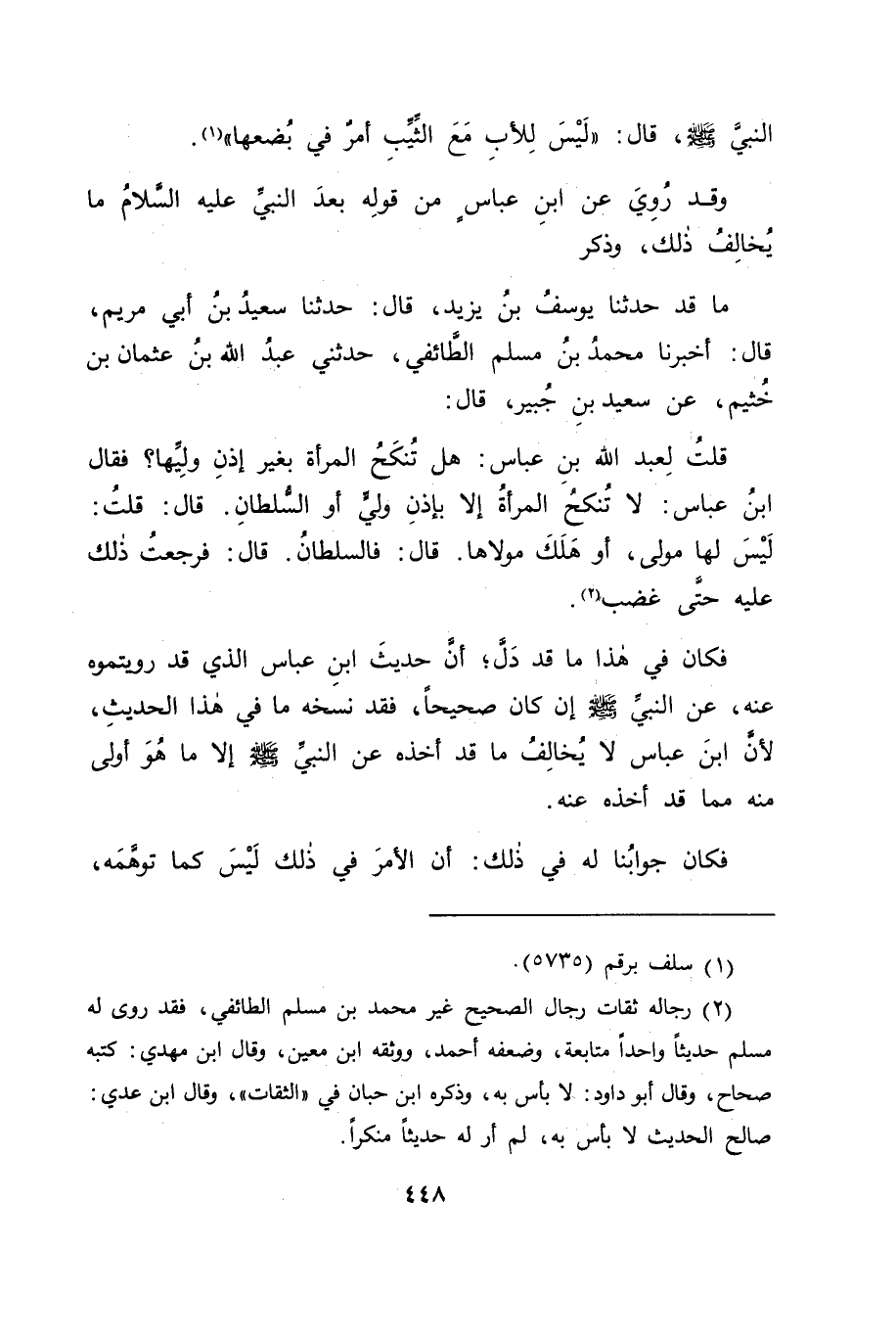 مَا قَدْ حَدَّثَنَا يُوسُفُ بْنُ يَزِيدَ قَالَ: حَدَّثَنَا سَعِيدُ بْنُ أَبِي مَرْيَمَ قَالَ: أَخْبَرَنَا مُحَمَّدُ بْنُ مُسْلِمٍ الطَّائِفِيُّ، حَدَّثَنِي عَبْدُ اللهِ بْنُ عُثْمَانَ بْنِ خُثَيْمٍ، عَنْ سَعِيدِ بْنِ جُبَيْرٍ قَالَ: قُلْتُ لِعَبْدِ اللهِ بْنِ عَبَّاسٍ: هَلْ تُنْكَحُ الْمَرْأَةُ بِغَيْرِ إِذْنِ وَلِيِّهَا؟ فَقَالَ ابْنُ عَبَّاسٍ: " لَا تُنْكَحُ الْمَرْأَةُ إِلَّا بِإِذْنِ وَلِيٍّ، أَوِ السُّلْطَانِ قَالَ: قُلْتُ: لَيْسَ لَهَا مَوْلًى، أَوْ هَلَكَ مَوْلَاهَا قَالَ: فَالسُّلْطَانُ قَالَ: فَرَجَعْتُ ذَلِكَ عَلَيْهِ حَتَّى غَضِبَ " فَكَانَ فِي هَذَا مَا قَدْ دَلَّ، أَنَّ حَدِيثَ ابْنِ عَبَّاسٍ الَّذِي قَدْ رَوَيْتُمُوهُ عَنْهُ، عَنِ النَّبِيِّ صَلَّى اللَّهُ عَلَيْهِ وَسَلَّمَ - إِنْ كَانَ صَحِيحًا - فَقَدْ نَسَخَهُ مَا فِي هَذَا الْحَدِيثِ؛ لِأَنَّ ابْنَ عَبَّاسٍ لَا يُخَالِفُ مَا قَدْ أَخَذَهُ عَنِ النَّبِيِّ صَلَّى اللَّهُ عَلَيْهِ وَسَلَّمَ، إِلَّا مَا هُوَ أَوْلَى مِنْهُ مِمَّا قَدْ أَخَذَهُ عَنْهُ. فَكَانَ جَوَابَنَا لَهُ فِي ذَلِكَ: أَنَّ الْأَمْرَ فِي ذَلِكَ لَيْسَ كَمَا تَوَهَّمَهُ، -[449]- وَلَكِنْ مَا إِلَى الْمَرْأَةِ مِمَّا فِي حَدِيثِ نَافِعِ بْنِ جُبَيْرِ بْنِ مُطْعِمٍ، عَنِ ابْنِ عَبَّاسٍ عَلَى أَنَّهُ إِلَيْهَا كَمَا تُحِبُّ أَنْ تَكُونَ تَفْعَلُهُ فِيهِ مِمَّا قَدْ جُعِلَ إِلَيْهَا أَنْ تُوَلِّيَهُ غَيْرَهَا مِنَ الرِّجَالِ الْقَوَّامِينَ عَلَيْهَا حَتَّى يَكُونَ مَنْ تُوَلِّيهِ مِنْهُمْ ذَلِكَ يَعْقِدُهُ عَلَيْهَا بِأَمْرِهَا مِمَّنْ يَرْضَاهُ، فَيَكُونُ ذَلِكَ الْعَقْدُ مِنْهُ عَلَيْهَا بِأَمْرِهَا عَقْدًا مِنْهَا إِيَّاهُ عَلَى نَفْسِهَا؛ لِأَنَّ عُقُودَ الْمُوَكَّلِينَ فِي هَذَا مُضَافَاتٌ إِلَى آمِرِيهِمْ، كَمَا يَقُولُ الرَّجُلُ: فَعَلْتُ كَذَا، لِمَا فُعِلَ بِأَمْرِهِ. فَخَرَج بِحَمْدِ اللهِ وَنِعْمَتِهِ أَنْ يَكُونَ شَيْءٌ مِمَّا ذَكَرْنَاهُ عَنِ ابْنِ عَبَّاسٍ، عَنِ النَّبِيِّ صَلَّى اللَّهُ عَلَيْهِ وَسَلَّمَ، وَمِمَّا ذَكَرْنَاهُ عَنْهُ مِمَّا قَالَهُ بَعْدَ النَّبِيِّ صَلَّى اللَّهُ عَلَيْهِ وَسَلَّمَ أَنْ يَكُونَ فِيهِ تَضَادٌّ وَلَا اخْتِلَافٌ، وَيَكُونُ حَقُّ الْوَلِيِّ فِيمَا رُوِيَ عَنِ ابْنِ عَبَّاسٍ، فِيمَا قَالَهُ بَعْدَ النَّبِيِّ صَلَّى اللَّهُ عَلَيْهِ وَسَلَّمَ هُوَ الَّذِي جَعَلَتْهُ الْمَرْأَةُ إِلَيْهِ مِمَّا جُعِلَ لَهَا أَنْ تَجْعَلَهُ إِلَيْهِ , وَمِمَّا لَيْسَ لَهُ اعْتِرَاضٌ عَلَيْهَا فِيهِ مَنْ عَقَدَ بِغَيْرِ أَمْرِهَا