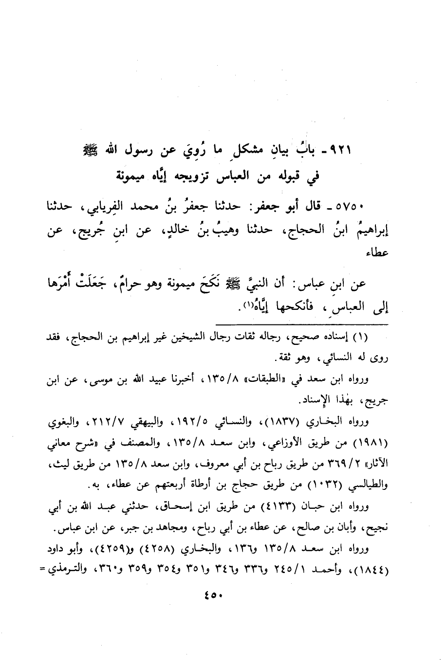 5750 - قَالَ: أَبُو جَعْفَرٍ: حَدَّثَنَا جَعْفَرُ بْنُ مُحَمَّدٍ الْفِرْيَابِيُّ، حَدَّثَنَا إِبْرَاهِيمُ بْنُ الْحَجَّاجِ، حَدَّثَنَا وُهَيْبُ بْنُ خَالِدٍ، عَنِ ابْنِ جُرَيْجٍ، عَنْ عَطَاءٍ، عَنِ ابْنِ عَبَّاسٍ، " أَنَّ النَّبِيَّ صَلَّى اللَّهُ عَلَيْهِ وَسَلَّمَ نَكَحَ مَيْمُونَةَ وَهُوَ حَرَامٌ، جَعَلَتْ أَمْرَهَا إِلَى الْعَبَّاسِ، فَأَنْكَحَهَا إِيَّاهُ " -[451]- فَقَالَ قَائِلٌ فِي هَذَا الْحَدِيثِ: إِنَّ النَّبِيَّ صَلَّى اللَّهُ عَلَيْهِ وَسَلَّمَ قَبِلَ تَزْوِيجَ الْعَبَّاسِ إِيَّاهُ مَيْمُونَةَ، وَلَيْسَ بِوَلِيٍّ لَهَا، وَفِي حَدِيثِ نَافِعِ بْنِ جُبَيْرٍ عَنْهُ مِمَّا قَدْ تَأَوَّلْتُمُوهُ فِي الْبَابِ الْأَوَّلِ عَلَى مَا تَأَوَّلْتُمُوهُ عَلَيْهِ، وَمِمَّا قَدْ صَحَّحْتُمُوهُ، وَحَدِيثِ سَعِيدِ بْنِ جُبَيْرٍ عَنْهُ عَلَيْهِ، وَهَذَا مِمَّا يُخَالِفُ ذَلِكَ مِنَ انْفِرَادِ الْمَرْأَةِ بِعَقْدِهَا التَّزْوِيجَ عَلَى نَفْسِهَا بِغَيْرِ أَمْرِ وَلِيِّهَا. وَكَانَ جَوَابَنَا لَهُ فِي ذَلِكَ: أَنَّهُ قَدْ يُحْتَمَلُ أَنْ تَكُونَ مَيْمُونَةُ لَمْ يَكُنْ أَحَدٌ مِنْ أَوْلِيَائِهَا حَاضِرًا، وَلَمْ يَكُنْ لَهَا وَلِيٌّ حِينَئِذٍ مِنْ قَوْمِهَا لِخِلَافِ أَدْيَانِهِمْ دِينَهَا، فَعَادَ أَمْرُهَا إِلَى مَنْ إِلَيْهِ وِلَايَةُ بَضْعِهَا، وَهُوَ رَسُولُ اللهِ صَلَّى اللَّهُ عَلَيْهِ وَسَلَّمَ، فَاحْتُمِلَ أَنْ تَكُونَ هِيَ ابْتَدَأَتْ ذَلِكَ بِجَعْلِهَا إِيَّاهُ إِلَى الْعَبَّاسِ، فَعَقَدَهُ الْعَبَّاسُ عَلَيْهَا، وَقَبِلَهُ مِنْهُ رَسُولُ اللهِ صَلَّى اللَّهُ عَلَيْهِ وَسَلَّمَ، فَكَانَ ذَلِكَ إِمْضَاءً مِنْهُ لِمَا كَانَ مِنْ جَعْلِهَا إِيَّاهُ إِلَى الْعَبَّاسِ، وَكَانَ فِي ذَلِكَ مَا قَدْ دَلَّ عَلَى إِجَازَةِ الْعُقُودِ لِلْأَشْيَاءِ الَّتِي كَانَتْ إِلَى غَيْرِ مَنْ عَقَدَهَا لِإِجَازَةِ مَنْ كَانَتْ إِلَيْهِ، كَمَا يَقُولُ ذَلِكَ مَنْ يَقُولُهُ مِنْ أَهْلِ الْعِلْمِ، مِنْهُمْ: أَبُو حَنِيفَةَ، وَمَالِكٌ، وَالثَّوْرِيُّ، وَأَصْحَابُهُمْ