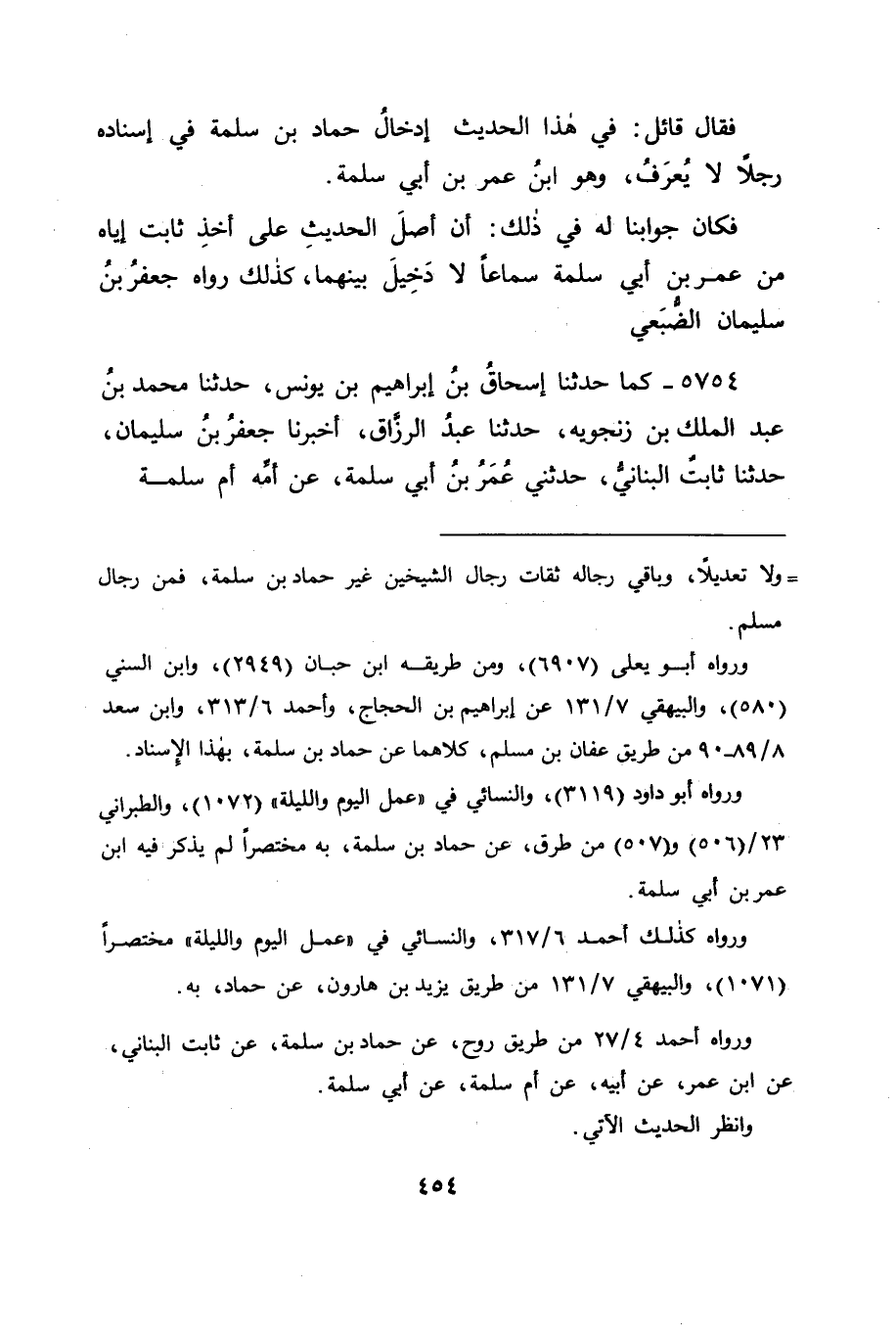 5754 - كَمَا حَدَّثَنَا إِسْحَاقُ بْنُ إِبْرَاهِيمَ بْنِ يُونُسَ، حَدَّثَنَا مُحَمَّدُ بْنُ عَبْدِ الْمَلِكِ بْنِ زَنْجُوَيْهِ، حَدَّثَنَا عَبْدُ الرَّزَّاقِ، أَخْبَرَنَا جَعْفَرُ بْنُ سُلَيْمَانَ، حَدَّثَنَا ثَابِتٌ الْبُنَانِيُّ، حَدَّثَنِي عُمَرُ بْنُ أَبِي سَلَمَةَ، عَنْ أُمِّهِ أُمِّ سَلَمَةَ، -[455]- عَنْ زَوْجِهَا أَبِي سَلَمَةَ قَالَ: سَمِعْتُ النَّبِيَّ صَلَّى اللَّهُ عَلَيْهِ وَسَلَّمَ يَقُولُ: " مَا مِنْ أَحَدٍ مِنَ الْمُسْلِمِينَ يُصَابُ بِمُصِيبَةٍ، فَيَقُولُ: إِنَّا لِلَّهِ، وَإِنَّا إِلَيْهِ رَاجِعُونَ، اللهُمَّ إِنِّي احْتَسَبْتُ مُصِيبَتِي عِنْدَكَ، فَأَبْدِلْنِي خَيْرًا مِنْهَا إِلَا أَبْدَلَهُ اللهُ خَيْرًا مِنْهَا ". فَلَمَّا تُوُفِّيَ أَبُو سَلَمَةَ قُلْتُ: إِنَّا لِلَّهِ، وَإِنَّا إِلَيْهِ رَاجِعُونَ، اللهُمَّ إِنِّي احْتَسَبْتُ مُصِيبَتِي، فَأَبْدِلْنِي بِهِ خَيْرًا مِنْهُ " قَالَتْ: وَجَعَلْتُ أَقُولُ فِي نَفْسِي: مَنْ خَيْرٌ مِنْ أَبِي سَلَمَةَ؟ فَجَاءَ رَسُولُ اللهِ صَلَّى اللَّهُ عَلَيْهِ وَسَلَّمَ، فَخَطَبَنِي فَتَزَوَّجْتُهُ " فَدَلَّ هَذَا الْحَدِيثُ: أَنَّ أَصْلَ الْحَدِيثِ هُوَ عَنْ عُمَرَ بْنِ أَبِي سَلَمَةَ -[456]- لَا دَخِيلَ بَيْنَهُمَا، وَقَدْ وَافَقَ زُهَيْرُ بْنُ الْعَلَاءِ جَعْفَرَ بْنَ سُلَيْمَانَ فِي إِسْنَادِ هَذَا الْحَدِيثِ أَيْضًا أَنَّهُ عَنْ ثَابِتٍ، عَنْ عُمَرَ بْنِ أَبِي سَلَمَةَ