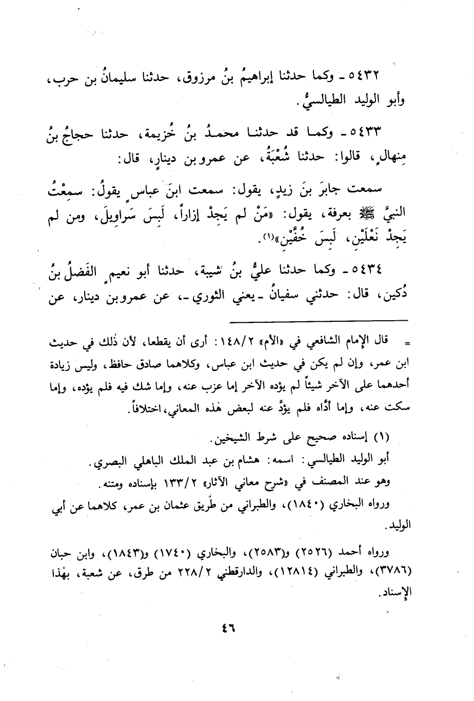 5433 - وَكَمَا قَدْ حَدَّثَنَا مُحَمَّدُ بْنُ خُزَيْمَةَ، حَدَّثَنَا حَجَّاجُ بْنُ مِنْهَالٍ، قَالُوا: حَدَّثَنَا شُعْبَةُ، عَنْ عَمْرِو بْنِ دِينَارٍ قَالَ: سَمِعْتُ جَابِرَ بْنَ زَيْدٍ يَقُولُ: سَمِعْتُ ابْنَ عَبَّاسٍ يَقُولُ: سَمِعْتُ النَّبِيَّ صَلَّى اللَّهُ عَلَيْهِ وَسَلَّمَ بِعَرَفَةَ يَقُولُ: " مَنْ لَمْ يَجِدْ إِزَارًا، لَبِسَ سَرَاوِيلَ، وَمَنْ لَمْ يَجِدْ نَعْلَيْنِ، لَبِسَ خُفَّيْنِ "