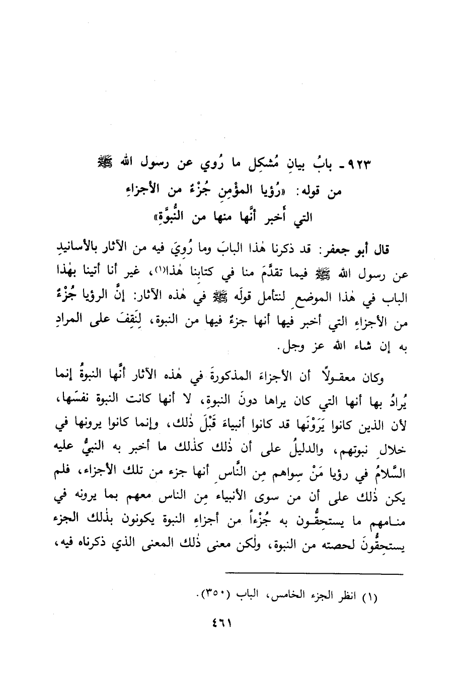 بَابُ بَيَانِ مُشْكِلِ مَا رُوِيَ عَنْ رَسُولِ اللهِ صَلَّى اللَّهُ عَلَيْهِ وَسَلَّمَ مِنْ قَوْلِهِ: " رُؤْيَا الْمُؤْمِنِ جُزْءٌ مِنَ الْأَجْزَاءِ الَّتِي أَخْبَرَ أَنَّهَا مِنْهَا مِنَ النُّبُوَّةِ " قَالَ أَبُو جَعْفَرٍ: قَدْ ذَكَرْنَا هَذَا الْبَابَ وَمَا رُوِيَ فِيهِ، مِنَ الْآثَارِ بِالْأَسَانِيدِ عَنْ رَسُولِ اللهِ صَلَّى اللَّهُ عَلَيْهِ وَسَلَّمَ فِيمَا تَقَدَّمَ مِنَّا فِي كِتَابِنَا هَذَا، غَيْرَ أَنَّا أَتَيْنَا بِهَذَا الْبَابِ فِي هَذَا الْمَوْضِعِ لِنَتَأَمَّلَ قَوْلَهُ صَلَّى اللَّهُ عَلَيْهِ وَسَلَّمَ فِي هَذِهِ الْآثَارِ: إِنَّ الرُّؤْيَا جُزْءٌ مِنَ الْأَجْزَاءِ الَّتِي أَخْبَرَ فِيهَا أَنَّهَا جُزْءٌ فِيهَا مِنَ النُّبُوَّةِ، لِنَقِفَ عَلَى الْمُرَادِ بِهِ إِنْ شَاءَ اللهُ عَزَّ وَجَلَّ، وَكَانَ مَعْقُولًا أَنَّ الْأَجْزَاءَ الْمَذْكُورَةَ فِي هَذِهِ الْآثَارِ أَنَّهَا النُّبُوَّةُ إِنَّمَا يُرَادُ بِهَا أَنَّهَا الَّتِي كَانَ يَرَاهَا دُونَ النُّبُوَّةِ، لَا أَنَّهَا كَانَتِ النُّبُوَّةَ نَفْسَهَا؛ لِأَنَّ الَّذِينَ كَانُوا يَرَوْنَهَا قَدْ كَانُوا أَنْبِيَاءَ قَبْلَ ذَلِكَ، وَإِنَّمَا كَانُوا يَرَوْنَهَا فِي خِلَالِ نُبُوَّتِهِمْ، وَالدَّلِيلُ عَلَى أَنَّ ذَلِكَ كَذَلِكَ مَا أَخْبَرَ بِهِ النَّبِيُّ عَلَيْهِ السَّلَامُ فِي رُؤْيَا مَنْ سِوَاهُمْ مِنَ النَّاسِ أَنَّهَا جُزْءٌ مِنْ تِلْكَ الْأَجْزَاءِ، فَلَمْ يَكُنْ ذَلِكَ عَلَى أَنَّ مَنْ سِوَى الْأَنْبِيَاءِ مِنَ النَّاسِ مَعَهُمْ بِمَا يَرَوْنَهُ فِي مَنَامِهِمْ مَا يَسْتَحِقُّونَ بِهِ جُزْءًا مِنْ أَجْزَاءِ النُّبُوَّةِ يَكُونُونَ بِذَلِكَ الْجُزْءِ يَسْتَحِقُّونَ لِحِصَّتِهِ مِنَ النُّبُوَّةِ، وَلَكِنَّ مَعْنَى ذَلِكَ الْمَعْنَى الَّذِي ذَكَرْنَاهُ فِيهِ،