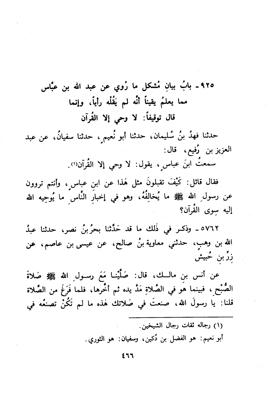حَدَّثَنَا فَهْدُ بْنُ سُلَيْمَانَ، حَدَّثَنَا أَبُو نُعَيْمٍ، حَدَّثَنَا سُفْيَانُ، عَنْ عَبْدِ الْعَزِيزِ بْنِ رُفَيْعٍ قَالَ: سَمِعْتُ ابْنَ عَبَّاسٍ يَقُولُ: " لَا وَحْيَ إِلَّا الْقُرْآنُ " فَقَالَ قَائِلٌ: كَيْفَ تَقْبَلُونَ مِثْلَ هَذَا عَنِ ابْنِ عَبَّاسٍ، وَأَنْتُمْ تَرْوُونَ عَنْ رَسُولِ اللهِ صَلَّى اللَّهُ عَلَيْهِ وَسَلَّمَ مَا يُخَالِفُهُ، وَهُوَ فِي إِخْبَارِ النَّاسِ مَا يُوحِيهِ اللهُ إِلَيْهِ سِوَى الْقُرْآنِ؟