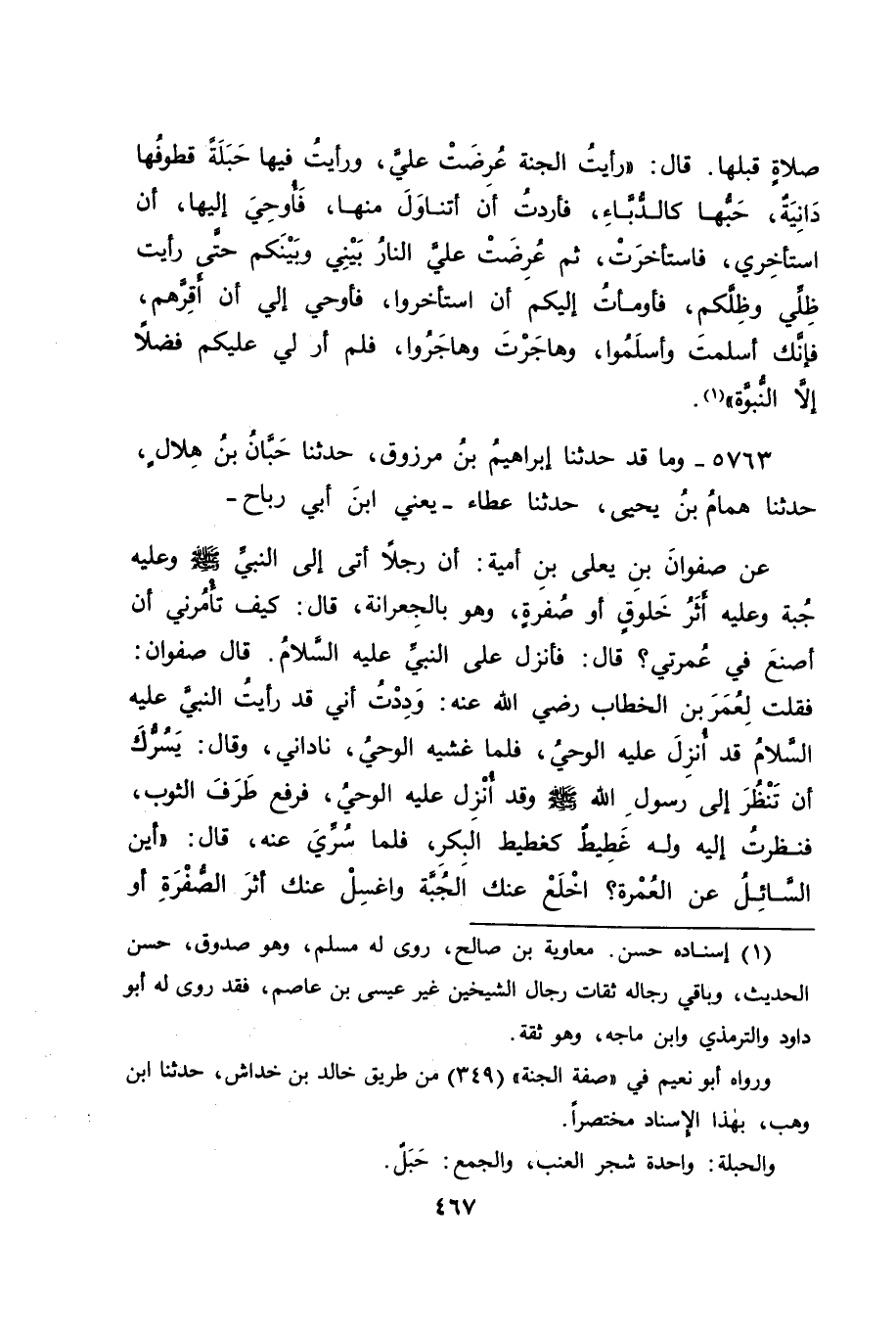 5763 - وَمَا قَدْ حَدَّثَنَا إِبْرَاهِيمُ بْنُ مَرْزُوقٍ، حَدَّثَنَا حَبَّانُ بْنُ هِلَالٍ، حَدَّثَنَا هَمَّامُ بْنُ يَحْيَى، حَدَّثَنَا عَطَاءٌ، يَعْنِي ابْنَ أَبِي رَبَاحٍ، عَنْ صَفْوَانَ بْنِ يَعْلَى بْنِ أُمَيَّةَ: أَنَّ رَجُلًا، أَتَى إِلَى النَّبِيِّ صَلَّى اللَّهُ عَلَيْهِ وَسَلَّمَ وَعَلَيْهِ جُبَّةٌ، وَعَلَيْهِ أَثَرُ خَلُوقٍ أَوْ صُفْرَةٍ، وَهُوَ بِالْجِعْرَانَةِ قَالَ: كَيْفَ تَأْمُرُنِي أَنْ أَصْنَعَ فِي عُمْرَتِي؟ قَالَ: فَأُنْزِلَ عَلَى النَّبِيِّ عَلَيْهِ السَّلَامُ. قَالَ صَفْوَانُ: فَقُلْتُ لِعُمَرَ بْنَ الْخَطَّابِ رَضِيَ اللهُ عَنْهُ: وَدِدْتُ أَنِّي قَدْ رَأَيْتُ النَّبِيَّ عَلَيْهِ السَّلَامُ قَدْ أُنْزِلَ عَلَيْهِ الْوَحْيُ، فَلَمَّا غَشِيَهُ الْوَحْيُ، نَادَانِي، وَقَالَ: يَسُرُّكَ أَنْ تَنْظُرَ إِلَى رَسُولِ اللهِ صَلَّى اللَّهُ عَلَيْهِ وَسَلَّمَ وَقَدْ أُنْزِلَ عَلَيْهِ الْوَحْيُ، فَرَفَعَ طَرَفَ الثَّوْبِ، فَنَظَرْتُ إِلَيْهِ وَلَهُ غَطِيطٌ كَغَطِيطِ الْبَكْرِ، فَلَمَّا سُرِّيَ عَنْهُ قَالَ: " أَيْنَ السَّائِلُ عَنِ الْعُمْرَةِ؟ اخْلَعْ عَنْكَ الْجُبَّةَ، وَاغْسِلْ عَنْكَ أَثَرَ الصُّفْرَةِ أَوِ -[468]- الْخَلُوقِ، وَاصْنَعْ فِي عُمْرَتِكَ مَا صَنَعْتَ فِي حَجَّتِكَ " قَالَ هَذَا الْقَائِلُ: فَفِي هَذَيْنِ الْأَثَرَيْنِ ذِكْرُ وَحْيٍ قَدْ كَانَ أُوحِيَ إِلَى رَسُولِ اللهِ صَلَّى اللَّهُ عَلَيْهِ وَسَلَّمَ مِمَّا لَيْسَ هُوَ بِقُرْآنٍ. فَكَانَ جَوَابَنَا لَهُ فِي ذَلِكَ: أَنَّ الَّذِي رَوَيْنَاهُ عَنِ ابْنِ عَبَّاسٍ مَعْنَاهُ عِنْدَنَا - وَاللهُ أَعْلَمُ - لَمْ يَكُنْ عَلَى دَفْعِ مَا فِي هَذَيْنِ الْأَثَرَيْنِ، وَلَكِنَّهُ جَاءَ بِهِ عَلَى مَا تُخَاطِبُ الْعَرَبُ بَعْضُهَا بَعْضًا، فَيَفْهَمُ الْمُخَاطَبُونَ لَهُمْ بِهَا، فَكَانَ يَعْنِي ابْنُ عَبَّاسٍ عِنْدَنَا - وَاللهُ أَعْلَمُ - بِقَوْلِهِ: لَا وَحْيَ إِلَّا الْقُرْآنُ، يَعْنِي الْقُرْآنَ نَفْسَهُ، وَمَا أَمَرَ بِهِ الْقُرْآنُ مِمَّا لَمْ يَقْبَلْهُ إِلَّا بِالْقُرْآنِ؛ لِأَنَّ -[469]- اللهَ تَعَالَى قَالَ: {وَمَا آتَاكُمُ الرَّسُولُ فَخُذُوهُ وَمَا نَهَاكُمْ عَنْهُ فَانْتَهُوا} [الحشر: 7] ، وَيَكُونُ ذَلِكَ مُرَادَ ابْنِ عَبَّاسٍ، كَمَا كَانَ مِنْ مُرَادِ عَلِيِّ بْنِ أَبِي طَالِبٍ - رَضِيَ اللهُ عَنْهُ - مِمَّا خَاطَبَ بِهِ أَبَا جُحَيْفَةَ