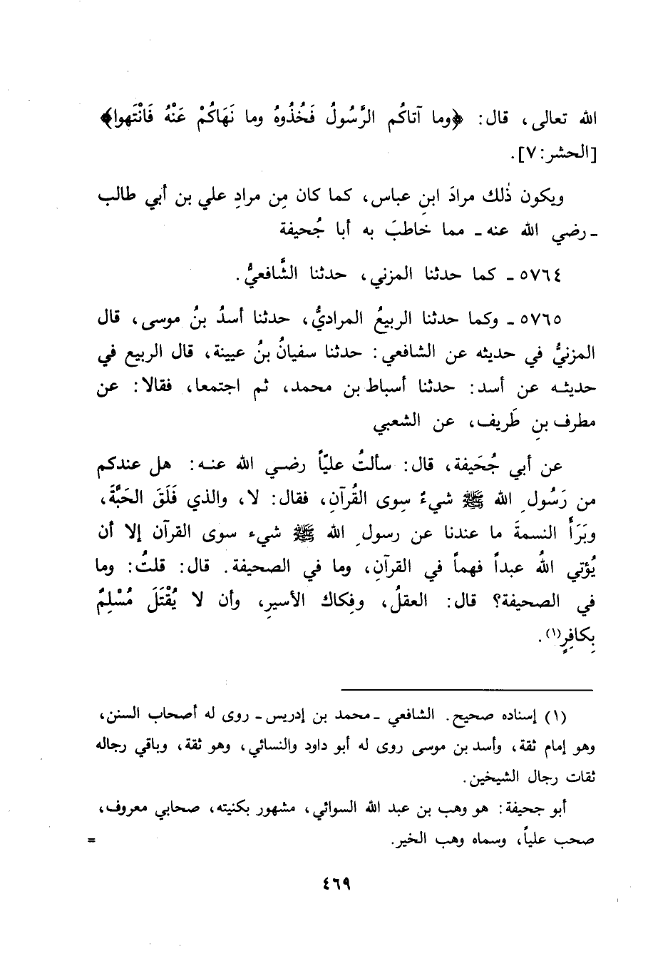 5765 - وَكَمَا حَدَّثَنَا الرَّبِيعُ الْمُرَادِيُّ، حَدَّثَنَا أَسَدُ بْنُ مُوسَى قَالَ الْمُزَنِيُّ فِي حَدِيثِهِ: عَنِ الشَّافِعِيِّ، حَدَّثَنَا سُفْيَانُ بْنُ عُيَيْنَةَ قَالَ الرَّبِيعُ فِي حَدِيثِهِ عَنْ أَسَدٍ، حَدَّثَنَا أَسْبَاطُ بْنُ مُحَمَّدٍ، ثُمَّ اجْتَمَعَا، فَقَالَا: عَنْ مُطَرِّفِ بْنِ طَرِيفٍ، عَنِ الشَّعْبِيِّ، عَنْ أَبِي جُحَيْفَةَ قَالَ: سَأَلْتُ عَلِيًّا رَضِيَ اللهُ عَنْهُ: هَلْ عِنْدَكُمْ مِنْ رَسُولِ اللهِ صَلَّى اللَّهُ عَلَيْهِ وَسَلَّمَ شَيْءٌ سِوَى الْقُرْآنِ، فَقَالَ: لَا، وَالَّذِي فَلَقَ الْحَبَّةَ، وَبَرَأَ النَّسَمَةَ مَا عِنْدَنَا عَنْ رَسُولِ اللهِ صَلَّى اللَّهُ عَلَيْهِ وَسَلَّمَ شَيْءٌ سِوَى الْقُرْآنِ , إِلَّا أَنْ يُؤْتِيَ اللهُ عَبْدًا فَهْمًا فِي الْقُرْآنِ، وَمَا فِي الصَّحِيفَةِ قَالَ: قُلْتُ: وَمَا فِي الصَّحِيفَةِ؟ قَالَ: الْعَقْلُ، وَفِكَاكُ الْأَسِيرِ، وَأَنْ لَا يُقْتَلَ مُسْلِمٌ بِكَافِرٍ -[471]- وَكَانَ عَلِيٌّ قَدْ قَالَ هَذَا الْقَوْلَ، وَحَلَفَ عَلَيْهِ بِمَا حَلَفَ عَلَيْهِ بِهِ، وَمَعَهُ مِنْ رَسُولِ اللهِ صَلَّى اللَّهُ عَلَيْهِ وَسَلَّمَ مِنَ السُّنَّةِ مَا قَدْ كَانَ مَعَهُ الَّتِي مِنْهَا الْوَحْيُ الَّذِي كَانَ يُوحَى إِلَيْهِ صَلَّى اللَّهُ عَلَيْهِ وَسَلَّمَ سِوَى الْقُرْآنِ دَاخِلًا فِي الْقُرْآنِ الَّذِي كَانَ قَبُولُهُمْ إِيَّاهُ مِنْهُ صَلَّى اللَّهُ عَلَيْهِ وَسَلَّمَ بِأَمْرِ الْقُرْآنِ إِيَّاهُمْ بِهِ، فَيَكُونُ مِثْلُ ذَلِكَ مَا كَانَ مِنِ ابْنِ عَبَّاسٍ مِنْ قَوْلِهِ: لَا وَحْيَ سِوَى الْقُرْآنِ، يُرِيدُ بِهِ أَنَّ الْقُرْآنَ لَمَّا كَانَ فِي أَعْلَى مَرَاتِبِ الْوَحْيِ الَّتِي مِنْهَا الْقُرْآنُ، وَمِنْهَا غَيْرُ الْقُرْآنِ قَالَ مِنْ أَجْلِ ذَلِكَ: هَذَا الْقُرْآنُ، كَمَا يَقُولُ الرَّجُلُ: لَا عَالِمَ سِوَى فُلَانٍ. وَكَمَا قَالَ مَنْ قَالَ: لَا زَاهِدَ إِلَّا عُمَرُ بْنُ عَبْدِ الْعَزِيزِ، لِمَا كَانَ مِنْهُ مِنْ تَرْكِهِ مَا كَانَ صَارَ إِلَيْهِ مِنَ الدُّنْيَا مِمَّا كَانَ غَيْرُهُ لَا يَتْرُكُ مَا هُوَ دُونَهُ، وَفِي الدُّنْيَا زُهَّادٌ كَثِيرٌ , إِلَّا أَنَّهُمْ لَمْ يَقْدِرُوا عَلَى مِثْلِ الَّذِي قَدَرَ عَلَيْهِ مِنْهَا عُمَرُ بْنُ عَبْدِ الْعَزِيزِ، فَتَزَهَّدُوا فِيهَا كَزُهْدِ عُمَرَ فِيهَا