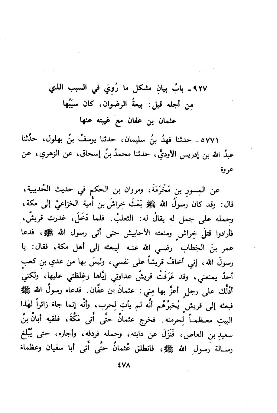 5771 - حَدَّثَنَا فَهْدُ بْنُ سُلَيْمَانَ، حَدَّثَنَا يُوسُفُ بْنُ بُهْلُولٍ، حَدَّثَنَا عَبْدُ اللهِ بْنُ إِدْرِيسَ الْأَوْدِيُّ، حَدَّثَنَا مُحَمَّدُ بْنُ إِسْحَاقَ، عَنِ الزُّهْرِيِّ، عَنْ عُرْوَةَ، عَنِ الْمِسْوَرِ بْنِ مَخْرَمَةَ، وَمَرْوَانَ بْنِ الْحَكَمِ، فِي حَدِيثِ الْحُدَيْبِيَةِ قَالَ: وَقَدْ كَانَ رَسُولُ اللهِ صَلَّى اللَّهُ عَلَيْهِ وَسَلَّمَ بَعَثَ خِرَاشَ بْنَ أُمَيَّةَ الْخُزَاعِيَّ إِلَى مَكَّةَ، وَحَمَلَهُ عَلَى جَمَلٍ لَهُ يُقَالُ لَهُ: الثَّعْلَبُ، فَلَمَّا دَخَلَ، غَدَرَتْ قُرَيْشٌ، فَأَرَادُوا قَتْلَ خِرَاشٍ، وَمَنَعَتْهُ الْأَحَابِيشُ، حَتَّى أَتَى رَسُولَ اللهِ صَلَّى اللَّهُ عَلَيْهِ وَسَلَّمَ، فَدَعَا عُمَرَ بْنَ الْخَطَّابِ رَضِيَ اللهُ عَنْهُ لِيَبْعَثَهُ إِلَى أَهْلِ مَكَّةَ، فَقَالَ: يَا رَسُولَ اللهِ، إِنِّي أَخَافُ قُرَيْشًا عَلَى نَفْسِي، وَلَيْسَ بِهَا مِنْ عَدِيِّ بْنِ كَعْبٍ أَحَدٌ يَمْنَعُنِي، وَقَدْ عَرَفَتْ قُرَيْشٌ عَدَاوَتِي إِيَّاهَا , وَغِلْظَتِي عَلَيْهَا، وَلَكِنِّي أَدُلُّكَ عَلَى رَجُلٍ أَعَزَّ بِهَا مِنِّي: عُثْمَانُ بْنُ عَفَّانَ، فَدَعَاهُ رَسُولُ اللهِ صَلَّى اللَّهُ عَلَيْهِ وَسَلَّمَ، فَبَعَثَهُ إِلَى قُرَيْشٍ يُخْبِرُهُمْ أَنَّهُ لَمْ يَأْتِ لِحَرْبٍ، وَأَنَّهُ إِنَّمَا جَاءَ زَائِرًا لِهَذَا الْبَيْتِ مُعَظِّمًا لِحُرْمَتِهِ، فَخَرَجَ عُثْمَانُ حَتَّى أَتَى مَكَّةَ، فَلَقِيَهُ أَبَانُ بْنُ سَعِيدِ بْنِ الْعَاصِ، فَنَزَلَ عَنْ دَابَّتِهِ، وَحَمَلَهُ فَرَدَفَهُ، وَأَجَارَهُ، حَتَّى يُبَلِّغَ رِسَالَةَ رَسُولِ اللهِ صَلَّى اللَّهُ عَلَيْهِ وَسَلَّمَ، فَانْطَلَقَ عُثْمَانُ حَتَّى أَتَى أَبَا سُفْيَانَ، وَعُظَمَاءَ -[479]- قُرَيْشٍ، فَبَلَّغَهُمْ عَنْ رَسُولِ اللهِ صَلَّى اللَّهُ عَلَيْهِ وَسَلَّمَ مَا أَرْسَلَهُ بِهِ، فَقَالُوا لِعُثْمَانَ: إِنْ شِئْتَ أَنْ تَطُوفَ أَنْتَ بِالْبَيْتِ فَطُفْ، فَقَالَ: مَا كُنْتُ أَفْعَلُ حَتَّى يَطُوفَ رَسُولُ اللهِ صَلَّى اللَّهُ عَلَيْهِ وَسَلَّمَ، وَاحْتَبَسَتْهُ قُرَيْشٌ عِنْدَهَا، فَبَلَغَ رَسُولَ اللهِ صَلَّى اللَّهُ عَلَيْهِ وَسَلَّمَ وَالْمُسْلِمِينَ أَنَّ عُثْمَانَ قَدْ قُتِلَ قَالَ ابْنُ إِسْحَاقَ: فَأَخْبَرَنِي عَبْدُ اللهِ بْنُ أَبِي بَكْرٍ، أَنَّ رَسُولَ اللهِ صَلَّى اللَّهُ عَلَيْهِ وَسَلَّمَ لَمَّا بَلَغَهُ أَنَّ عُثْمَانَ قَدْ قُتِلَ، فَكَانَتْ بَيْعَةُ الرِّضْوَانِ، ثُمَّ أَتَى رَسُولَ اللهِ صَلَّى اللَّهُ عَلَيْهِ وَسَلَّمَ أَنَّ الَّذِي ذُكِرَ مِنْ أَمْرِ عُثْمَانَ كَانَ بَاطِلًا " فَفِي هَذَا الْحَدِيثِ: أَنَّ تِلْكَ الْبَيْعَةَ كَانَتْ يَوْمَئِذٍ لَمَّا بَلَغَ رَسُولَ اللهِ صَلَّى اللَّهُ عَلَيْهِ وَسَلَّمَ -[480]- أَنَّهُ كَانَ مِنْ أَهْلِ مَكَّةَ فِي عُثْمَانَ مَا بَلَغَهُ أَنَّهُ كَانَ مِنْهُمْ فِيهِ: فَبَايَعَ النَّاسَ حِينَئِذٍ عَلَى مَا بَايَعَهُمْ مِمَّا لَمْ يَكُنْ بَايَعَهُمْ مِنْ قَبْلُ عَلَى مِثْلِهِ