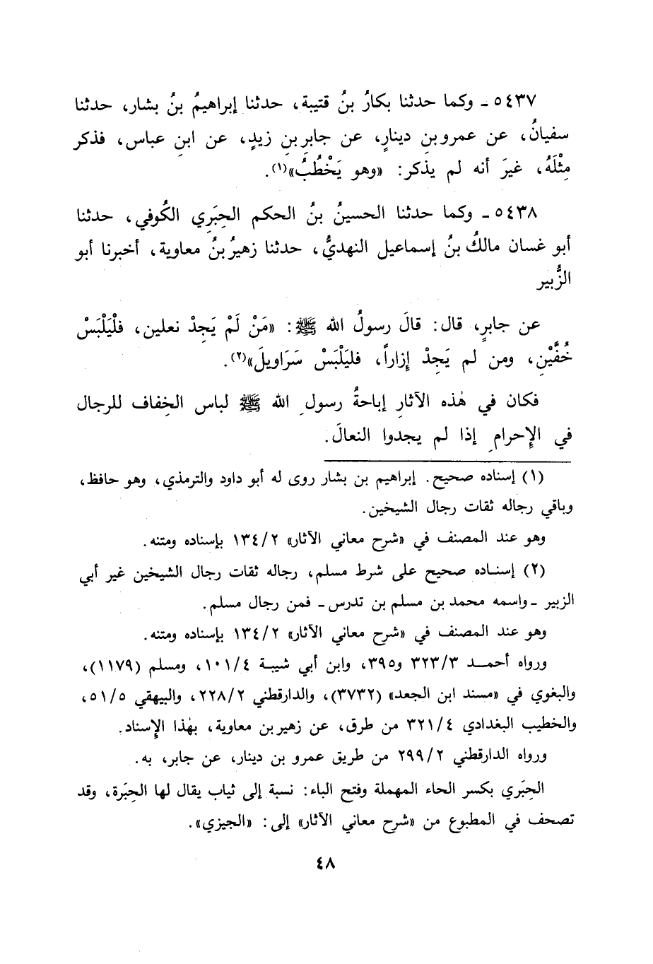 5438 - وَكَمَا حَدَّثَنَا الْحُسَيْنُ بْنُ الْحَكَمِ الْحِبَرِيُّ الْكُوفِيُّ، حَدَّثَنَا أَبُو غَسَّانَ مَالِكُ بْنُ إِسْمَاعِيلَ النَّهْدِيُّ، حَدَّثَنَا زُهَيْرُ بْنُ مُعَاوِيَةَ، أَخْبَرَنَا أَبُو الزُّبَيْرِ، عَنْ جَابِرٍ قَالَ: قَالَ رَسُولُ اللهِ صَلَّى اللَّهُ عَلَيْهِ وَسَلَّمَ: " مَنْ لَمْ يَجِدْ نَعْلَيْنِ فَلْيَلْبَسْ خُفَّيْنِ، وَمَنْ لَمْ يَجِدْ إِزَارًا، فَلْيَلْبَسْ سَرَاوِيلَ " فَكَانَ فِي هَذِهِ الْآثَارِ إِبَاحَةُ رَسُولِ اللهِ صَلَّى اللَّهُ عَلَيْهِ وَسَلَّمَ لِبَاسَ الْخِفَافِ لِلرِّجَالِ فِي الْإِحْرَامِ إِذَا لَمْ يَجِدُوا النِّعَالَ. -[49]- وَقَدْ رُوِيَ عَنْ رَسُولِ اللهِ صَلَّى اللَّهُ عَلَيْهِ وَسَلَّمَ فِي ذَلِكَ مَعْنًى آخَرُ