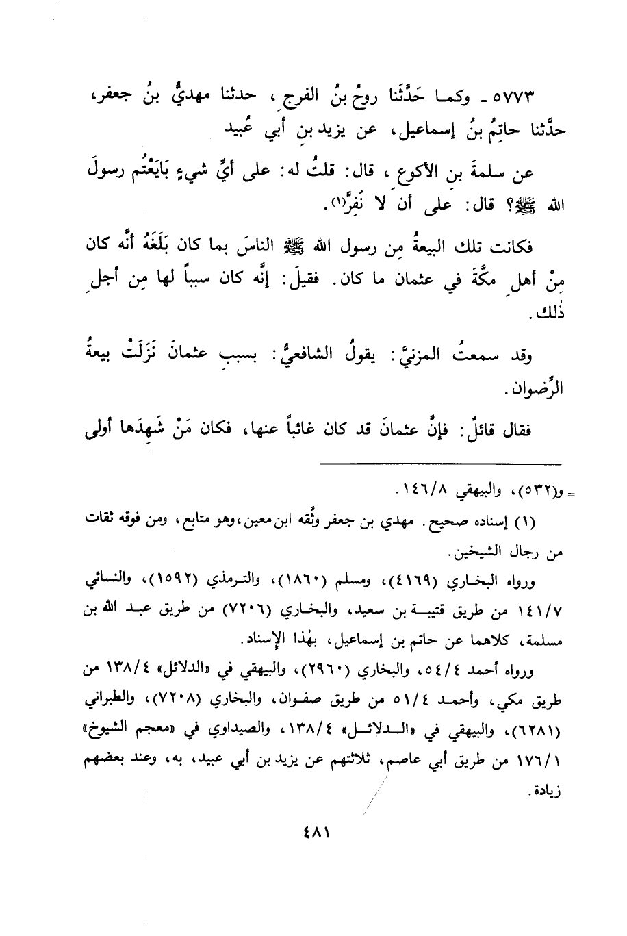 5773 - وَكَمَا حَدَّثَنَا رَوْحُ بْنُ الْفَرَجِ، حَدَّثَنَا مَهْدِيُّ بْنُ جَعْفَرٍ، حَدَّثَنَا حَاتِمُ بْنُ إِسْمَاعِيلَ، عَنْ يَزِيدَ بْنِ أَبِي عُبَيْدٍ، عَنْ سَلَمَةَ بْنِ الْأَكْوَعِ قَالَ: قُلْتُ لَهُ: عَلَى أَيِّ شَيْءٍ بَايَعْتُمْ رَسُولَ اللهِ صَلَّى اللَّهُ عَلَيْهِ وَسَلَّمَ؟ قَالَ: عَلَى أَنْ لَا نَفِرَّ " فَكَانَتْ تِلْكَ الْبَيْعَةُ مِنْ رَسُولِ اللهِ صَلَّى اللَّهُ عَلَيْهِ وَسَلَّمَ النَّاسَ بِمَا كَانَ بَلَغَهُ أَنَّهُ كَانَ مِنْ أَهْلِ مَكَّةَ فِي عُثْمَانَ مَا كَانَ. فَقِيلَ: إِنَّهُ كَانَ سَبَبًا لَهَا مِنْ أَجْلِ ذَلِكَ. وَقَدْ سَمِعْتُ الْمُزَنِيَّ: يَقُولُ الشَّافِعِيُّ: بِسَبَبِ عُثْمَانَ نَزَلَتْ بَيْعَةُ الرِّضْوَانِ. فَقَالَ قَائِلٌ: فَإِنَّ عُثْمَانَ قَدْ كَانَ غَائِبًا عَنْهَا، فَكَانَ مَنْ شَهِدَهَا أَوْلَى -[482]- بِالْفَضِيلَةِ بِهَا مِنْ عُثْمَانَ. فَكَانَ جَوَابَنَا لَهُ فِي ذَلِكَ: أَنَّ هَذَا الْكَلَامَ يَدُلُّ عَلَى جَهْلٍ مِنْ هَذَا الْقَائِلِ بِآثَارِ رَسُولِ اللهِ صَلَّى اللَّهُ عَلَيْهِ وَسَلَّمَ، وَبِمَنَاقِبِ أَصْحَابِهِ فِيهَا؛ لِأَنَّ عُثْمَانَ قَدْ كَانَ لَهُ فِيهَا مِنْ رَسُولِ اللهِ صَلَّى اللَّهُ عَلَيْهِ وَسَلَّمَ أَجَلَّ مَا كَانَ مِنْهُ لِأَحَدٍ مِنَ النَّاسِ مِمَّنْ كَانَ حَاضِرًا لِتِلْكَ الْبَيْعَةِ، وَمِمَّنْ كَانَ غَابَ عَنْهَا