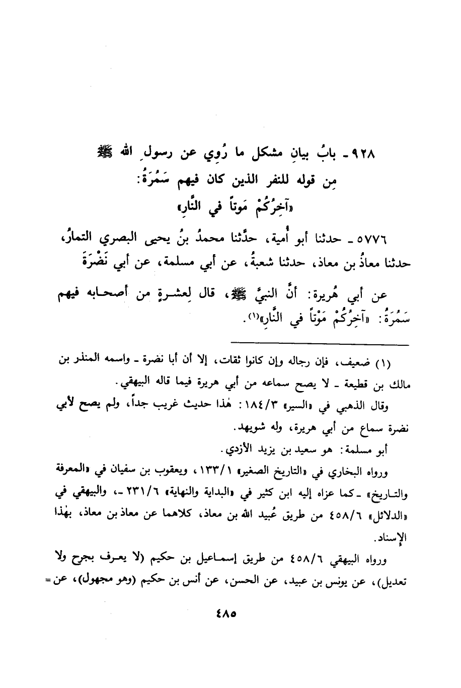 5776 - حَدَّثَنَا أَبُو أُمَيَّةَ، حَدَّثَنَا مُحَمَّدُ بْنُ يَحْيَى الْبَصْرِيُّ التَّمَّارُ، حَدَّثَنَا مُعَاذُ بْنُ مُعَاذٍ، حَدَّثَنَا شُعْبَةُ، عَنْ أَبِي مَسْلَمَةَ، عَنْ أَبِي نَضْرَةَ، عَنْ أَبِي هُرَيْرَةَ، أَنَّ النَّبِيَّ صَلَّى اللَّهُ عَلَيْهِ وَسَلَّمَ قَالَ لِعَشْرَةٍ مِنْ أَصْحَابِهِ فِيهِمْ سَمُرَةُ: " آخِرُكُمْ مَوْتًا فِي النَّارِ ". -[486]-