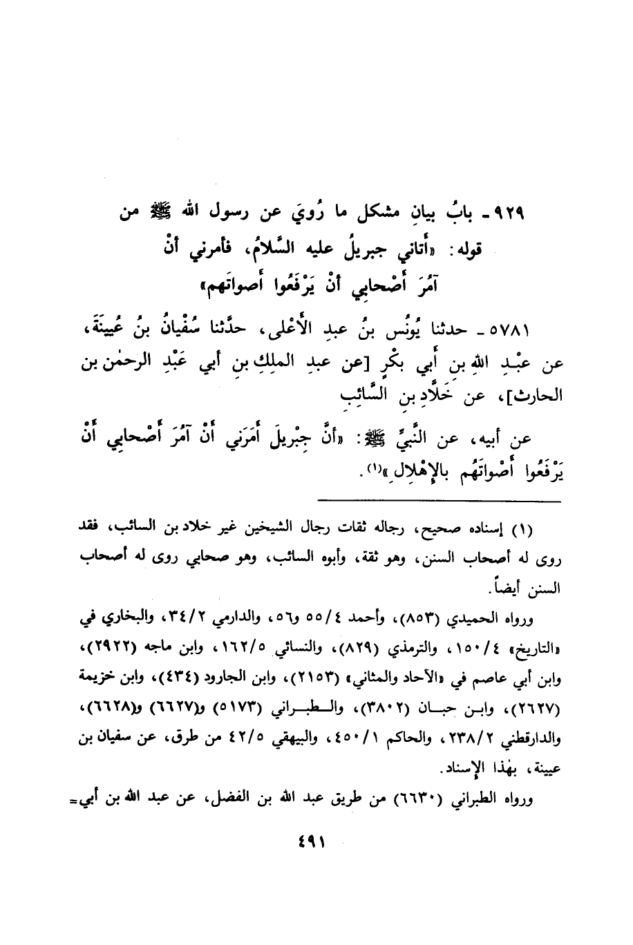 5781 - حَدَّثَنَا يُونُسُ بْنُ عَبْدِ الْأَعْلَى، حَدَّثَنَا سُفْيَانُ بْنُ عُيَيْنَةَ، عَنْ عَبْدِ اللهِ بْنِ أَبِي بَكْرٍ، عَنْ عَبْدِ الْمَلِكِ بْنِ أَبِي عَبْدِ الرَّحْمَنِ بْنِ الْحَارِثِ، عَنْ خَلَّادِ بْنِ السَّائِبِ، عَنْ أَبِيهِ، عَنِ النَّبِيِّ صَلَّى اللَّهُ عَلَيْهِ وَسَلَّمَ: " أَنَّ جِبْرِيلَ أَمَرَنِي أَنْ آمُرَ أَصْحَابِيَ أَنْ يَرْفَعُوا أَصْوَاتَهُمْ بِالْإِهْلَالِ "