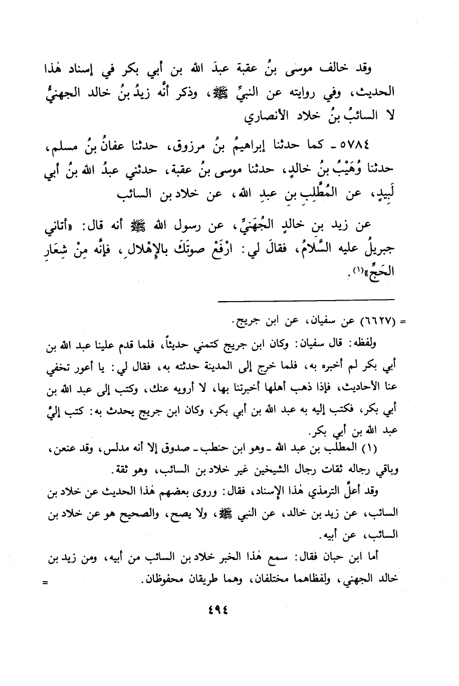 5784 - كَمَا حَدَّثَنَا إِبْرَاهِيمُ بْنُ مَرْزُوقٍ، حَدَّثَنَا عَفَّانُ بْنُ مُسْلِمٍ، حَدَّثَنَا وُهَيْبُ بْنُ خَالِدٍ، حَدَّثَنَا مُوسَى بْنُ عُقْبَةَ، حَدَّثَنِي عَبْدُ اللهِ بْنُ أَبِي لَبِيدٍ، عَنِ الْمُطَّلِبِ بْنِ عَبْدِ اللهِ، عَنْ خَلَّادِ بْنِ السَّائِبِ، عَنْ زَيْدِ بْنِ خَالِدٍ الْجُهَنِيِّ، عَنْ رَسُولِ اللهِ صَلَّى اللَّهُ عَلَيْهِ وَسَلَّمَ أَنَّهُ قَالَ: " أَتَانِي جِبْرِيلُ عَلَيْهِ السَّلَامُ، فَقَالَ لِي: ارْفَعْ صَوْتَكَ بِالْإِهْلَالِ، فَإِنَّهُ مِنْ شِعَارِ الْحَجِّ " -[495]-