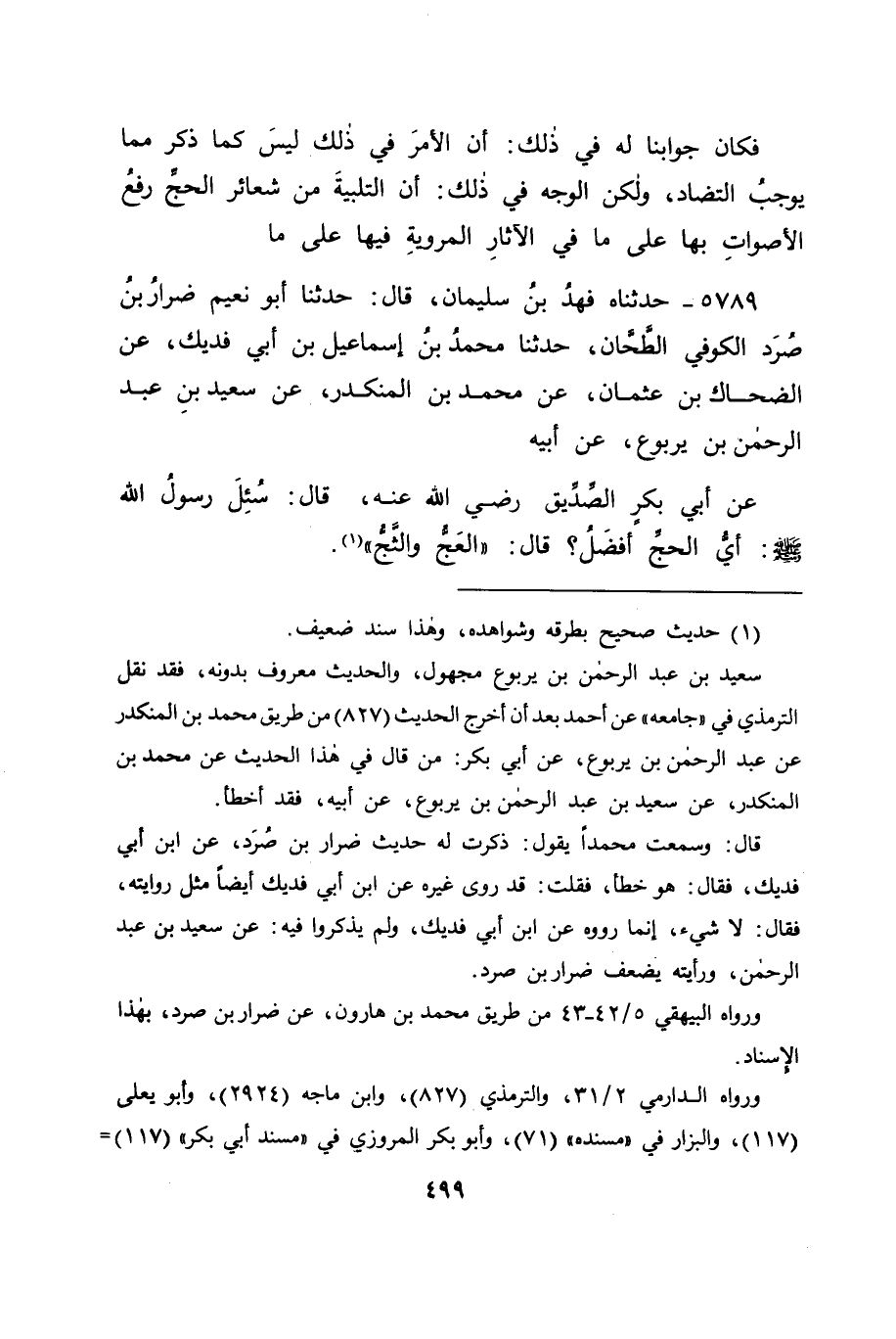 5789 - حَدَّثَنَا فَهْدُ بْنُ سُلَيْمَانَ قَالَ: حَدَّثَنَا أَبُو نُعَيْمٍ ضِرَارُ بْنُ صُرَدَ الْكُوفِيُّ الطَّحَّانُ، حَدَّثَنَا مُحَمَّدُ بْنُ إِسْمَاعِيلَ بْنِ أَبِي فُدَيْكٍ، عَنِ الضَّحَّاكِ بْنِ عُثْمَانَ، عَنْ مُحَمَّدِ بْنِ الْمُنْكَدِرِ، عَنْ سَعِيدِ بْنِ عَبْدِ الرَّحْمَنِ بْنِ يَرْبُوعٍ، عَنْ أَبِيهِ، عَنْ أَبِي بَكْرٍ الصِّدِّيقِ رَضِيَ اللهُ عَنْهُ قَالَ: سُئِلَ رَسُولُ اللهِ صَلَّى اللَّهُ عَلَيْهِ وَسَلَّمَ: أَيُّ الْحَجِّ أَفْضَلُ؟ قَالَ: " الْعَجُّ وَالثَّجُّ " -[501]- فَكَانَ: الْعَجُّ الْمَذْكُورُ فِي هَذَا الْحَدِيثِ: هُوَ الْعَجُّ بِالتَّلْبِيَةِ، وَالثَّجُّ الْمَذْكُورُ فِيهِ: هُوَ نَحْرُ الْبُدْنِ، وَكَذَلِكَ حَدَّثَنَا سُلَيْمَانُ بْنُ شُعَيْبٍ، عَنْ أَبِيهِ، عَنْ مُحَمَّدِ بْنِ الْحَسَنِ، عَنْ أَبِي يُوسُفَ، عَنْ أَبِي حَنِيفَةَ، فَكَانَ مِنْ شَعَائِرِ الْحَجِّ رَفْعُ الْأَصْوَاتِ بِالتَّلْبِيَةِ، وَكَانَ الْحَجُّ بَائِنًا بِذَلِكَ كَمَا بَانَ بِهِ فِي سِوَى التَّلْبِيَةِ مِنْ شَعَائِرِ الْحَجِّ مِنْ حَلْقِ الرُّءُوسِ عِنْدَ حِلِّ الْمُحْرِمِينَ بِهِ، وَمِنَ اجْتِنَابِ مَا يَجْتَنِبُونَهُ فِيهِ مِنْ حَلْقِ الشَّعْرِ، وَقَصِّ الْأَظْفَارِ، وَمِمَّا سِوَى ذَلِكَ، وَلَمْ يَكُنْ فِي رَفْعِ الْأَصْوَاتِ بِالتَّكْبِيرِ الْمَذْكُورِ فِي حَدِيثِ أَبِي مُوسَى هَذَانِ الْوَجْهَانِ اللَّذَانِ ذَكَرْنَاهُمَا فِي هَذَيْنِ الْأَمْرَيْنِ، فَانْتَفَى أَنْ يَكُونَ لِأَحَدِهِمَا مَا يُوجِبُ تَضَادَّ الْآخَرِ مِنْهُمَا