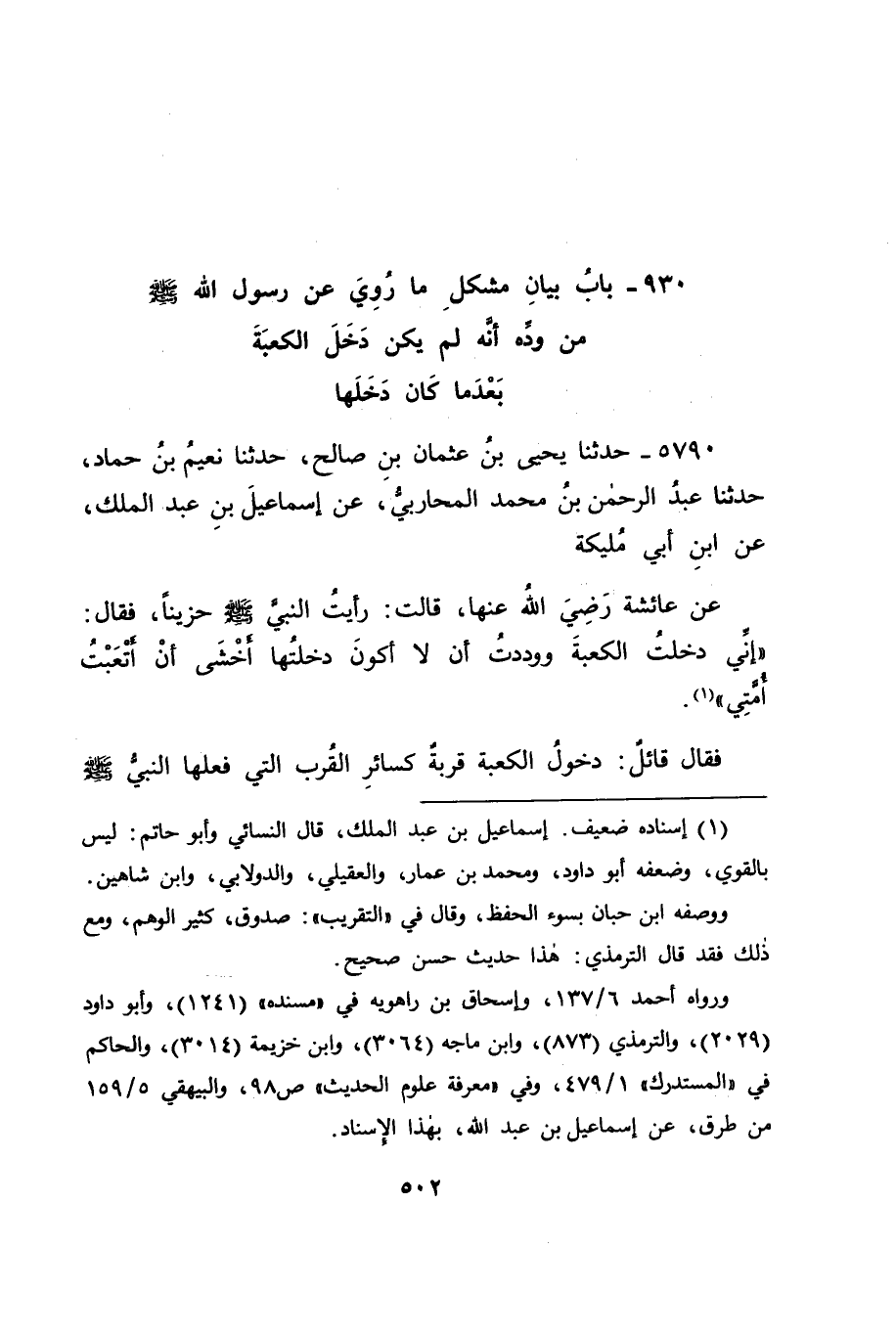 5790 - حَدَّثَنَا يَحْيَى بْنُ عُثْمَانَ بْنِ صَالِحٍ، حَدَّثَنَا نُعَيْمُ بْنُ حَمَّادٍ، حَدَّثَنَا عَبْدُ الرَّحْمَنِ بْنُ مُحَمَّدٍ الْمُحَارِبِيُّ، عَنْ إِسْمَاعِيلَ بْنِ عَبْدِ الْمَلِكِ، عَنِ ابْنِ أَبِي مُلَيْكَةَ، عَنْ عَائِشَةَ، رَضِيَ اللهُ عَنْهَا قَالَتْ: رَأَيْتُ النَّبِيَّ صَلَّى اللَّهُ عَلَيْهِ وَسَلَّمَ حَزِينًا، فَقَالَ: " إِنِّي دَخَلْتُ الْكَعْبَةَ , وَوَدِدْتُ أَنْ لَا أَكُونَ دَخَلْتُهَا , أَخْشَى أَنْ أَتْعَبْتُ أُمَّتِي " فَقَالَ قَائِلٌ: دُخُولُ الْكَعْبَةِ قُرْبَةٌ كَسَائِرِ الْقُرَبِ الَّتِي فَعَلَهَا النَّبِيُّ صَلَّى اللَّهُ عَلَيْهِ وَسَلَّمَ -[503]- لِتَقْتَدِيَ أُمَّتُهُ بِهِ فِيهَا، فَمَا وَجْهُ مَا رَوَيْتُمُوهُ عَنْهُ فِي هَذَا الْحَدِيثِ؟، فَكَانَ جَوَابَنَا لَهُ فِي ذَلِكَ: أَنَّهُ قَدْ يُحْتَمَلُ أَنْ يَكُونَ رَسُولُ اللهِ صَلَّى اللَّهُ عَلَيْهِ وَسَلَّمَ أَرَادَ بِذَلِكَ الْقَوْلِ الْخَوْفَ مِنْهُ عَلَى أَنَّهُ يَكُونُ الِاقْتِدَاءُ بِهِ فِيمَا فَعَلَهُ مَنْ أَرَادَ بِذَلِكَ الْقَوْلِ الْخَوْفَ مِنْهُ عَلَى ذَلِكَ حَتَّى يَكُونَ عِنْدَهُمْ مِمَّا لَا يَتِمُّ حَجُّهُمْ إِلَّا بِهِ، فَأَهَمَّهُ ذَلِكَ لَا مَا سِوَاهُ , كَمَا جَاءَ بَنِي عَبْدِ الْمُطَّلِبِ لَمَّا هَمَّ بِالنَّزْعِ مَعَهُمْ مِنْ مَاءِ زَمْزَمَ