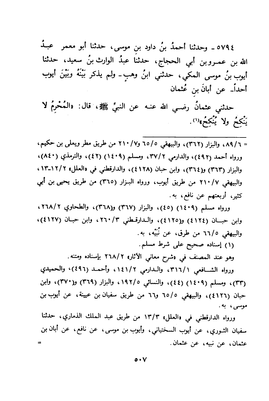 5794 - وَحَدَّثَنَا أَحْمَدُ بْنُ دَاوُدَ بْنِ مُوسَى، حَدَّثَنَا أَبُو مَعْمَرٍ عَبْدُ اللهِ بْنُ عَمْرِو بْنِ أَبِي الْحَجَّاجِ، حَدَّثَنَا عَبْدُ الْوَارِثِ بْنُ سَعِيدٍ، حَدَّثَنَا أَيُّوبُ بْنُ مُوسَى الْمَكِّيُّ، حَدَّثَنِي ابْنُ وَهْبٍ، وَلَمْ يَذْكُرْ بَيْنَهُ وَبَيْنَ أَيُّوبَ أَحَدًا , عَنْ أَبَانَ بْنِ عُثْمَانَ، حَدَّثَنِي عُثْمَانُ رَضِيَ اللهُ عَنْهُ، عَنِ النَّبِيِّ صَلَّى اللَّهُ عَلَيْهِ وَسَلَّمَ قَالَ: " الْمُحْرِمُ لَا يَنْكِحُ، وَلَا يُنْكِحُ "