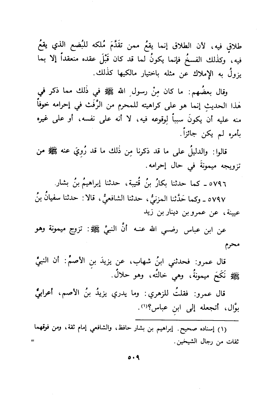 5797 - وَكَمَا حَدَّثَنَا الْمُزَنِيُّ، حَدَّثَنَا الشَّافِعِيُّ قَالَا: حَدَّثَنَا سُفْيَانُ بْنُ عُيَيْنَةَ، عَنْ عَمْرِو بْنِ دِينَارِ بْنِ زَيْدٍ، عَنِ ابْنِ عَبَّاسٍ رَضِيَ اللهُ عَنْهُ، أَنَّ النَّبِيَّ صَلَّى اللَّهُ عَلَيْهِ وَسَلَّمَ " تَزَوَّجَ مَيْمُونَةَ وَهُوَ مُحْرِمٌ " قَالَ عَمْرٌو: فَحَدَّثَنِي ابْنُ شِهَابٍ، عَنْ يَزِيدَ بْنِ الْأَصَمِّ: أَنَّ النَّبِيَّ صَلَّى اللَّهُ عَلَيْهِ وَسَلَّمَ نَكَحَ مَيْمُونَةَ، وَهِيَ خَالَتُهُ، وَهُوَ حَلَالٌ قَالَ عَمْرٌو: فَقُلْتُ لِلزُّهْرِيِّ: وَمَا يَدْرِي يَزِيدُ بْنُ الْأَصَمِّ، أَعْرَابِيٌّ بَوَّالٌ، أَتَجْعَلُهُ إِلَى ابْنِ عَبَّاسٍ؟ -[510]- فَكَانَ هَذَا مِمَّا لَا يُخْتَلَفُ عَنِ ابْنِ عَبَّاسٍ فِيهِ، وَقَدْ رُوِيَ عَنْ عَائِشَةَ مُوَافَقَتُهَا إِيَّاهُ عَلَى ذَلِكَ