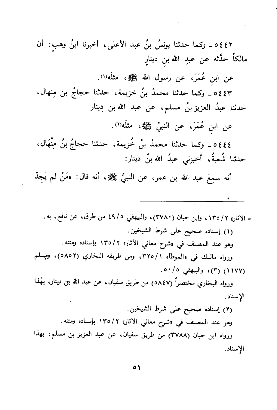 5444 - وَكَمَا حَدَّثَنَا مُحَمَّدُ بْنُ خُزَيْمَةَ، حَدَّثَنَا حَجَّاجُ بْنُ مِنْهَالٍ، حَدَّثَنَا شُعْبَةُ، أَخْبَرَنِي عَبْدُ اللهِ بْنُ دِينَارٍ، أَنَّهُ سَمِعَ عَبْدَ اللهِ بْنَ عُمَرَ، عَنِ النَّبِيِّ صَلَّى اللَّهُ عَلَيْهِ وَسَلَّمَ أَنَّهُ قَالَ: " مَنْ لَمْ يَجِدْ -[52]- نَعْلَيْنِ، فَلْيَلْبَسْ خُفَّيْنِ، وَلْيَقْطَعْهُمَا مِنْ عِنْدِ الْكَعْبَيْنِ " قَالَ أَبُو جَعْفَرٍ: فَفِي هَذِهِ الْآثَارِ أَنَّ مَنْ لَمْ يَجِدْ نَعْلَيْنِ مِنَ الْمُحْرِمِينَ مِنَ الرِّجَالِ كَانَ لَهُ أَنْ يَلْبَسَ الْخُفَّيْنِ بَعْدَ أَنْ يَقْطَعَهُمَا أَسْفَلَ مِنَ الْكَعْبَيْنِ. فَقَالَ قَائِلٌ: هَذِهِ مَعَانٍ مُتَضَادَّةٌ، قَدْ رَوَيْتُمْ كُلَّ مَعْنًى مِنْهَا بِالْآثَارِ الَّتِي رَوَيْتُمُوهُ بِهَا، فَهَلْ تَجِدُونَ وَجْهًا تَحْمِلُونَهَا عَلَيْهِ حَتَّى يَنْتَفِيَ عَنْهَا هَذَا التَّضَادُّ؟ فَكَانَ جَوَابَنَا لَهُ فِي ذَلِكَ: أَنَّ الْوَجْهَ الَّذِي وَجَدْنَاهُ يَصِحُّ عَلَيْهِ، وَهُوَ أَوْلَى الْوُجُوهِ بِهَا عِنْدَنَا - وَاللهُ أَعْلَمُ - أَنْ يَكُونَ كَانَ حُكْمُ لِبَاسِ الْخِفَافِ فِي الْإِحْرَامِ لِلرِّجَالِ مُبَاحًا عِنْدَ وُجُودِ النِّعَالِ، وَعِنْدَ عَدَمِهَا فِي الْإِحْرَامِ , كَمَا فِي حَدِيثِ عَبْدِ الرَّحْمَنِ بْنِ عَوْفٍ الَّذِي بَدَأْنَا بِذِكْرِهِ فِي هَذَا الْبَابِ ثُمَّ نُسِخَ ذَلِكَ , فَمُنِعُوا مِنْ لِبْسِهَا فِي حَالِ وُجُودِ النِّعَالِ , وَأُبِيحَ لَهُمْ لُبْسُهَا فِي حَالِ عَدَمِ النِّعَالِ عَلَى مَا فِي حَدِيثَيِ ابْنِ عَبَّاسٍ، وَجَابِرٍ اللَّذَيْنِ ثَنَّيْنَا بِذِكْرِهِمَا فِي هَذَا الْبَابِ، ثُمَّ نُسِخَ ذَلِكَ، فَأُبِيحَ لُبْسُهُمَا فِي الْإِحْرَامِ فِي حَالِ عَدَمِ النِّعَالِ بَعْدَ أَنْ تُقْطَعَ أَسْفَلُ مِنَ الْكَعْبَيْنِ عَلَى مَا فِي حَدِيثِ ابْنِ عُمَرَ الَّذِي ثَلَّثْنَا بِرِوَايَتِهِ فِي هَذَا الْبَابِ. -[53]- وَهَذَا بَابٌ مِنَ الْفِقْهِ قَدِ اخْتَلَفَ أَهْلُهُ فِيهِ بَعْدَ إِجْمَاعِهِمْ عَلَى نَسْخِ مَا فِي حَدِيثِ عَبْدِ الرَّحْمَنِ الَّذِي بَدَأْنَا بِذِكْرِهِ فِي هَذَا الْبَابِ. فَقَالَتْ طَائِفَةٌ مِنْهُمْ بِمَا فِي حَدِيثَيِ ابْنِ عَبَّاسٍ، وَجَابِرٍ اللَّذَيْنِ ثَنَّيْنَا بِذِكْرِهِمَا. وَمِمَّنْ قَالَ ذَلِكَ مِنْهُمُ: الشَّافِعِيُّ. وَقَدْ رَوَاهُ بَعْضُ النَّاسِ عَنِ الثَّوْرِيِّ، وَقَالَتْ طَائِفَةٌ مِنْهُمْ بِمَا فِي حَدِيثِ ابْنِ عُمَرَ الَّذِي ثَلَّثْنَا بِذِكْرِهِ فِي هَذَا الْبَابِ، وَمِمَّنْ قَالَ ذَلِكَ مِنْهُمْ: أَبُو حَنِيفَةَ وَمَالِكُ بْنُ أَنَسٍ، وَأَصْحَابُهُمَا، وَكَانَ وَجْهَ ذَلِكَ فِي النَّظَرِ: أَنَّهُمْ لَمَّا وَجَدُوا لِبَاسَ الْخِفَافِ لِوَاجِدِي النِّعَالِ فِي الْإِحْرَامِ مَمْنُوعًا مِنْهُ، نُظِرَ كَيْفَ حُكْمُهُ عِنْدَ عَدَمِ النِّعَالِ، فَوُجِدَتِ الْأَشْيَاءُ الْمَمْنُوعُ مِنْهَا فِي الْإِحْرَامِ فِي غَيْرِ أَحْوَالِ الضَّرُورَاتِ، مِنْهَا: لِبَاسُ الْقَمِيصِ، وَحَلْقُ الشَّعْرِ، وَكَانَ مَنِ اضْطُرَّ إِلَى ذَلِكَ، فَحَلَقَ شَعْرَهُ مِنْ أَذًى، أَوْ لَبِسَ قَمِيصَهُ مِنْ أَذًى، لَمْ تُسْقِطِ الضَّرُورَةُ عَنْهُ الْكَفَّارَةَ الَّتِي كَانَتْ تَكُونُ عَلَيْهِ لَوْ كَانَتْ مِنْهُ تِلْكَ الْأَشْيَاءُ فِي غَيْرِ حَالِ الضَّرُورَةِ، فَعَقَلُوا بِذَلِكَ: أَنَّ الضَّرُورَاتِ الَّتِي تُوجِبُ الْإِبَاحَاتِ لِلْأَشْيَاءِ الْمَحْظُورَاتِ فِي غَيْرِ حَالِ الضَّرُورَاتِ، إِنَّمَا تَرْفَعُ الْآثَامَ لَا مَا سِوَاهَا، فَكَانَ مِثْلَ ذَلِكَ أَيْضًا الضَّرُورَةُ إِلَى لِبَاسِ الْخِفَافِ إِذَا عَدِمَتِ النِّعَالُ، وَأُبِيحَ بِذَلِكَ لُبْسُهَا فِي الْإِحْرَامِ أَنْ تَرْفَعَ الْآثَامَ، وَلَا تَرْفَعَ الْكَفَّارَاتِ 