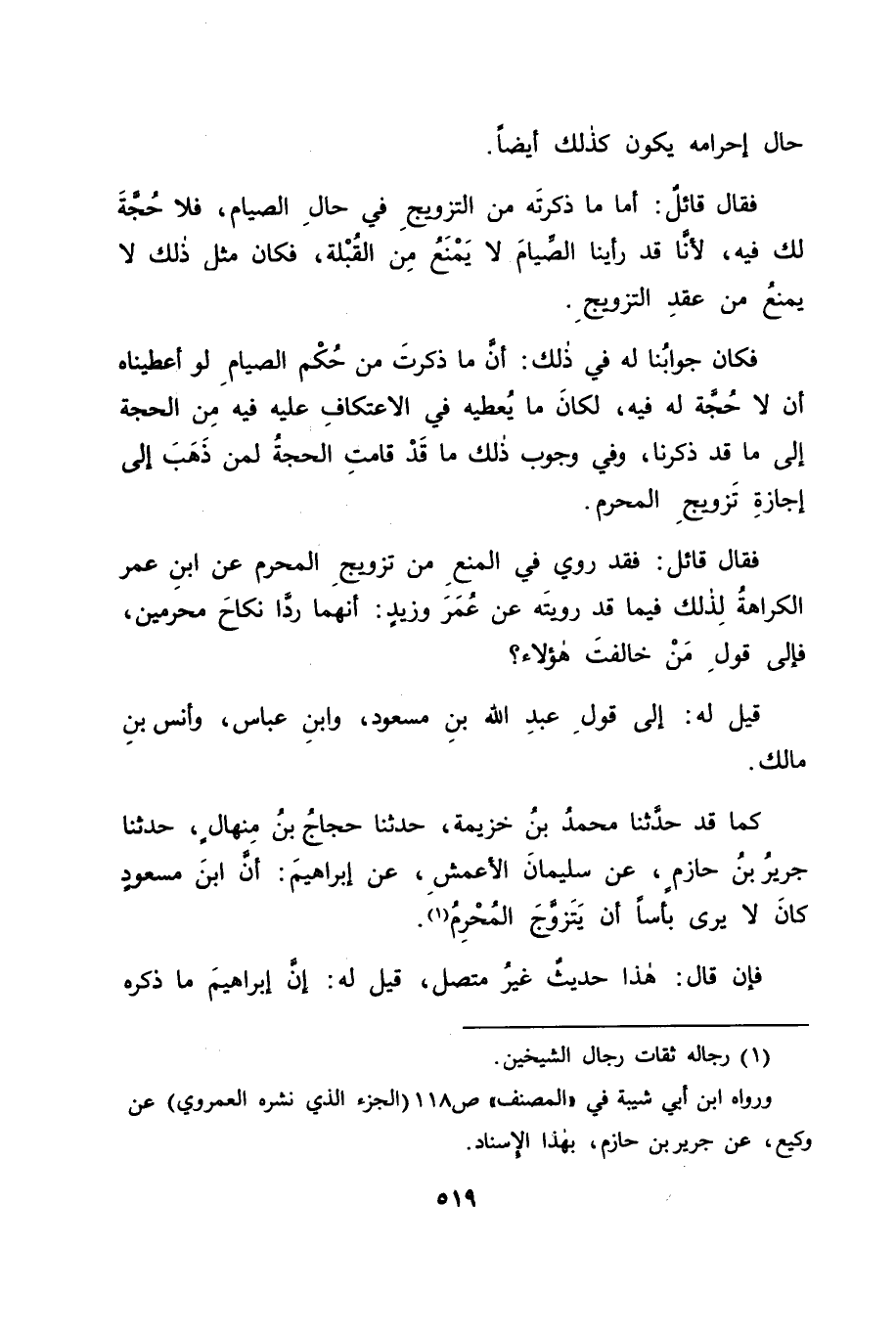 كَمَا قَدْ حَدَّثَنَا مُحَمَّدُ بْنُ خُزَيْمَةَ , حَدَّثَنَا حَجَّاجُ بْنُ مِنْهَالٍ، حَدَّثَنَا جَرِيرُ بْنُ حَازِمٍ، عَنْ سُلَيْمَانَ الْأَعْمَشِ، عَنْ إِبْرَاهِيمَ: " أَنَّ ابْنَ مَسْعُودٍ كَانَ لَا يَرَى بَأْسًا أَنْ يَتَزَوَّجَ الْمُحْرِمُ " فَإِنْ قَالَ: هَذَا حَدِيثٌ غَيْرُ مُتَّصِلٍ. قِيلَ لَهُ: إِنَّ إِبْرَاهِيمَ مَا ذَكَرَهُ -[520]- عَنِ ابْنِ مَسْعُودٍ مِمَّا لَمْ يَذْكُرْ بَيْنَهُ وَبَيْنَهُ فِيهِ أَحَدًا، فَهُوَ عَنْ جَمَاعَةٍ، عَنِ ابْنِ مَسْعُودٍ، كَمَا حَدَّثَنَا إِبْرَاهِيمُ بْنُ مَرْزُوقٍ، حَدَّثَنَا وَهْبٌ، أَوْ بِشْرُ بْنُ عُمَرَ أَبُو جَعْفَرٍ - يَشُكُّ فِيمَنْ حَدَّثَ بِهِ عَنْهُ مِنْهُمَا - حَدَّثَنَا شُعْبَةُ، عَنْ سُلَيْمَانَ الْأَعْمَشِ قَالَ: قُلْتُ لِإِبْرَاهِيمَ: إِذَا حَدَّثْتَ فَأَسْنِدْ، قَالَ: إِذَا قُلْتُ لَكَ: قَالَ عَبْدُ اللهِ، فَلَمْ أَقُلْ ذَلِكَ حَتَّى حَدَّثَنِيهِ عَنْ عَبْدِ اللهِ غَيْرُ وَاحِدٍ، وَإِذَا قُلْتُ: حَدَّثَنِي فُلَانٌ، عَنْ عَبْدِ اللهِ، فَهُوَ الَّذِي حَدَّثَنِي