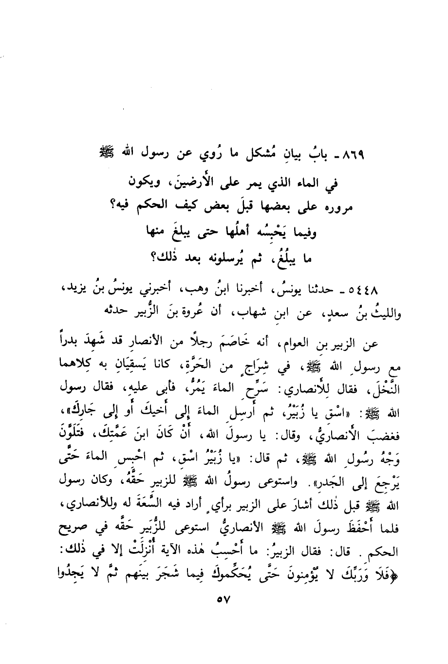5448 - حَدَّثَنَا يُونُسُ، أَخْبَرَنَا ابْنُ وَهْبٍ، أَخْبَرَنِي يُونُسُ بْنُ يَزِيدَ، وَاللَّيْثُ بْنُ سَعْدٍ، عَنِ ابْنِ شِهَابٍ، أَنَّ عُرْوَةَ بْنَ الزُّبَيْرِ، حَدَّثَهُ، عَنِ الزُّبَيْرِ بْنِ الْعَوَّامِ، أَنَّهُ خَاصَمَ رَجُلًا مِنَ الْأَنْصَارِ قَدْ شَهِدَ بَدْرًا مَعَ رَسُولِ اللهِ صَلَّى اللَّهُ عَلَيْهِ وَسَلَّمَ، فِي شِرَاجٍ مِنَ الْحَرَّةِ، كَانَا يَسْقِيَانِ بِهِ كِلَاهُمَا النَّخْلَ، فَقَالَ الْأَنْصَارِيُّ: سَرِّحِ الْمَاءَ يَمُرُّ، فَأَبَى عَلَيْهِ، فَقَالَ رَسُولُ اللهِ صَلَّى اللَّهُ عَلَيْهِ وَسَلَّمَ: " اسْقِ يَا زُبَيْرُ، ثُمَّ أَرْسِلِ الْمَاءَ إِلَى أَخِيكَ , أَوْ إِلَى جَارِكَ "، فَغَضِبَ الْأَنْصَارِيُّ، وَقَالَ: يَا رَسُولَ اللهِ، أَنْ كَانَ ابْنَ عَمَّتِكَ، فَتَلَوَّنَ وَجْهُ رَسُولِ اللهِ صَلَّى اللَّهُ عَلَيْهِ وَسَلَّمَ، ثُمَّ قَالَ: " يَا زُبَيْرُ اسْقِ، ثُمَّ احْبِسِ الْمَاءَ حَتَّى يَرْجِعَ إِلَى الْجَدْرِ "، وَاسْتَوْعَى رَسُولُ اللهِ صَلَّى اللَّهُ عَلَيْهِ وَسَلَّمَ لِلزُّبَيْرِ حَقَّهُ، وَكَانَ رَسُولُ اللهِ صَلَّى اللَّهُ عَلَيْهِ وَسَلَّمَ قَبْلَ ذَلِكَ أَشَارَ عَلَى الزُّبَيْرِ بِرَأْيٍ أَرَادَ فِيهِ السَّعَةَ لَهُ وَلِلْأَنْصَارِيِّ، فَلَمَّا أَحْفَظَ رَسُولَ اللهِ صَلَّى اللَّهُ عَلَيْهِ وَسَلَّمَ الْأَنْصَارِيُّ اسْتَوْعَى لِلزُّبَيْرِ حَقَّهُ فِي صَرِيحِ الْحُكْمِ , قَالَ: فَقَالَ الزُّبَيْرُ: مَا أَحْسِبُ هَذِهِ الْآيَةَ أُنْزِلَتْ إِلَّا فِي ذَلِكَ: {فَلَا وَرَبِّكَ لَا يُؤْمِنُونَ حَتَّى يُحَكِّمُوكَ فِيمَا شَجَرَ بَيْنَهُمْ ثُمَّ لَا يَجِدُوا -[58]- فِي أَنْفُسِهِمْ حَرَجًا مِمَّا قَضَيْتَ وَيُسَلِّمُوا تَسْلِيمًا} [النساء: 65] أَحَدُهُمَا يَزِيدُ عَلَى صَاحِبِهِ فِي الْقِصَّةِ , قَالَ لَنَا يُونُسُ: قَالَ لَنَا ابْنُ وَهْبٍ: الْجَدْرُ: الْأَصْلُ -[59]-