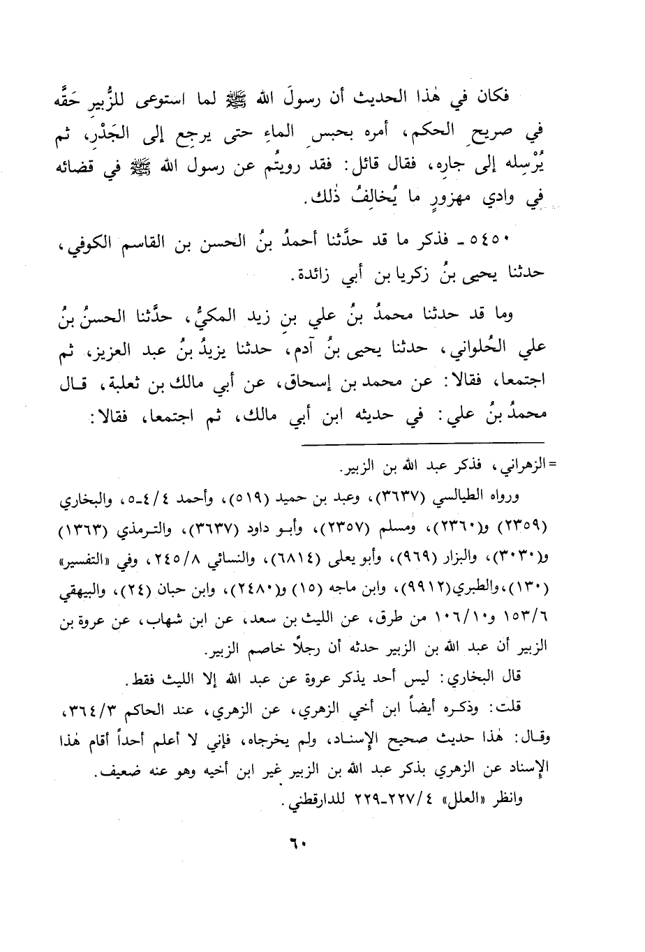 5450 - فَذَكَرَ مَا قَدْ حَدَّثَنَا أَحْمَدُ بْنُ الْحَسَنِ بْنِ الْقَاسِمِ الْكُوفِيُّ، حَدَّثَنَا يَحْيَى بْنُ زَكَرِيَّا بْنِ أَبِي زَائِدَةَ، وَمَا قَدْ حَدَّثَنَا مُحَمَّدُ بْنُ عَلِيِّ بْنِ زَيْدٍ الْمَكِّيُّ، حَدَّثَنَا الْحَسَنُ بْنُ عَلِيٍّ الْحُلْوَانِيُّ، حَدَّثَنَا يَحْيَى بْنُ آدَمَ، حَدَّثَنَا يَزِيدُ بْنُ عَبْدِ الْعَزِيزِ، ثُمَّ اجْتَمَعَا، فَقَالَا: عَنْ مُحَمَّدِ بْنِ إِسْحَاقَ، عَنْ أَبِي مَالِكِ بْنِ ثَعْلَبَةَ , قَالَ مُحَمَّدُ بْنُ عَلِيٍّ فِي حَدِيثِهِ: ابْنُ أَبِي مَالِكٍ، ثُمَّ اجْتَمَعَا، فَقَالَا: -[61]- عَنْ أَبِيهِ قَالَ: اخْتُصِمَ إِلَى رَسُولِ اللهِ صَلَّى اللَّهُ عَلَيْهِ وَسَلَّمَ فِي مَهْزُورٍ: وَادِي بَنِي قُرَيْظَةَ، " فَقَضَى أَنَّ الْمَاءَ إِلَى الْكَعْبَيْنِ، لَا يَحْبِسُ الْأَعْلَى عَلَى الْأَسْفَلِ " فَكَانَ فِي هَذَا الْحَدِيثِ قَضَاءُ رَسُولِ اللهِ صَلَّى اللَّهُ عَلَيْهِ وَسَلَّمَ أَنَّ الْمَاءَ يَحْبِسُهُ إِلَى الْجَدْرِ: وَهَذَانِ يَخْتَلِفَانِ، فَكَانَ جَوَابَنَا لَهُ فِي ذَلِكَ، أَنَّهُ قَدْ يُحْتَمَلُ أَنْ يَكُونَ كَانَ مِقْدَارُ مَا يَبْلُغُ الْكَعْبَيْنِ مِنَ الْمَاءِ مِثْلَ الَّذِي يَبْلُغُ الْجَدْرَ مِنْهُ، فَكَانَ ذَلِكَ الْمَعْنَى مِمَّا قَدْ يَجُوزُ أَنْ يُذْكَرَ بِبُلُوغِ الْمَاءِ إِلَى الْكَعْبَيْنِ، وَمِمَّا قَدْ يَجُوزُ أَنْ يُذْكَرَ بِبُلُوغِهِ الْجَدْرَ، فَذَكَرَهُ رَسُولُ اللهِ صَلَّى اللَّهُ عَلَيْهِ وَسَلَّمَ مَرَّةً بِهَذَا، وَمَرَّةً بِهَذَا، وَهَذَا أَوْلَى مَا حُمِلَ عَلَيْهِ مَا يُرْوَى عَنْهُ مِنْ هَذَا وَمِنْ غَيْرِهِ، لَا عَلَى مَا مَعَهُ التَّضَادُّ وَالتَّنَافِي، وَاللهُ الْمُوَفِّقُ