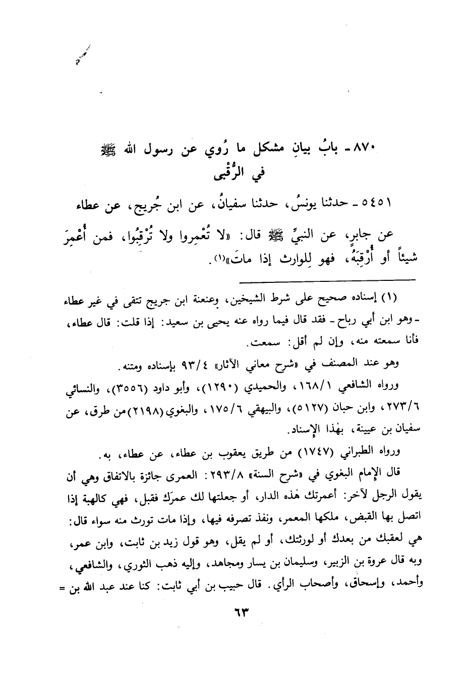 5451 - حَدَّثَنَا يُونُسُ، حَدَّثَنَا سُفْيَانُ، عَنِ ابْنِ جُرَيْجٍ، عَنْ عَطَاءٍ، عَنْ جَابِرٍ، عَنِ النَّبِيِّ صَلَّى اللَّهُ عَلَيْهِ وَسَلَّمَ قَالَ: " لَا تُعْمِرُوا وَلَا تُرْقِبُوا، فَمَنْ أُعْمِرَ شَيْئًا أَوْ أُرْقِبَهُ، فَهُوَ لِلْوَارِثِ إِذَا مَاتَ "