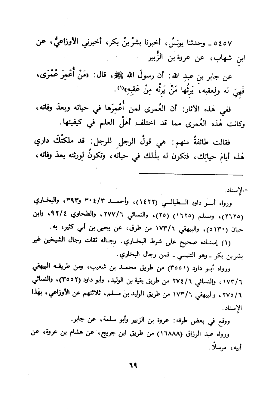 5457 - وَحَدَّثَنَا يُونُسُ، أَخْبَرَنَا بِشْرُ بْنُ بَكْرٍ، أَخْبَرَنِي الْأَوْزَاعِيُّ، عَنِ ابْنِ شِهَابٍ، عَنْ عُرْوَةَ بْنِ الزُّبَيْرِ، عَنْ جَابِرِ بْنِ عَبْدِ اللهِ، أَنَّ رَسُولَ اللهِ صَلَّى اللَّهُ عَلَيْهِ وَسَلَّمَ قَالَ: " مَنْ أُعْمِرَ عُمْرَى، فَهِيَ لَهُ وَلِعَقِبِهِ، يَرِثُهَا مَنْ يَرِثُهُ مِنْ عَقِبِهِ " فَفِي هَذِهِ الْآثَارِ: أَنَّ الْعُمْرَى لِمَنْ أُعْمِرَهَا فِي حَيَاتِهِ وَبَعْدَ وَفَاتِهِ , وَكَانَتْ هَذِهِ الْعُمْرَى مِمَّا قَدِ اخْتَلَفَ أَهْلُ الْعِلْمِ فِي كَيْفِيَّتِهَا، فَقَالَتْ طَائِفَةٌ مِنْهُمْ: هِيَ قَوْلُ الرَّجُلِ لِلرَّجُلِ: قَدْ مَلَّكْتُكَ دَارِي هَذِهِ أَيَّامَ حَيَاتِكَ، فَتَكُونَ لَهُ بِذَلِكَ فِي حَيَاتِهِ، وَتَكُونَ لِوَرَثَتِهِ بَعْدَ وَفَاتِهِ. -[70]- وَمِمَّنْ ذَهَبَ إِلَى ذَلِكَ: أَبُو حَنِيفَةَ، وَالثَّوْرِيُّ، وَأَصْحَابُهُمَا، وَالشَّافِعِيُّ. وَقَالَ آخَرُونَ: الْعُمْرَى الَّتِي لَهَا هَذَا الْحُكْمُ هِيَ الْعُمْرَى الَّتِي يَقُولُ الرَّجُلُ لِلرَّجُلِ: قَدْ أَعْمَرْتُكَ وَلِعَقِبِكَ دَارِي هَذِهِ، فَتَكُونَ لَهُ فِي حَيَاتِهِ، وَإِنْ لَمْ يَذْكُرْ فِيهَا: وَلِعَقِبِكَ، رَجَعَتْ إِلَى الْمُعْمِرِ بَعْدَ مَوْتِ الْمُعْمَرِ. وَمِمَّنْ كَانَ يَقُولُ ذَلِكَ مِنْهُمُ: ابْنُ شِهَابٍ، وَمَالِكٌ، وَكَثِيرٌ مِنْ أَهْلِ الْمَدِينَةِ، وَاحْتَجَّ الْقَائِلُونَ لِقَوْلِهِمْ فِي ذَلِكَ: بِمَا قَدْ حَدَّثَنَا عُبَيْدُ بْنُ رِجَالٍ، حَدَّثَنَا أَحْمَدُ بْنُ صَالِحٍ، حَدَّثَنَا عَبْدُ الرَّزَّاقِ، أَخْبَرَنَا مَعْمَرٌ، عَنِ الزُّهْرِيِّ، عَنْ أَبِي سَلَمَةَ بْنِ عَبْدِ الرَّحْمَنِ، عَنْ جَابِرِ بْنِ عَبْدِ اللهِ قَالَ: إِنَّمَا الْعُمْرَى الَّتِي أَجَازَ رَسُولُ اللهِ صَلَّى اللَّهُ عَلَيْهِ وَسَلَّمَ أَنْ يَقُولَ: هِيَ لَكَ وَلِعَقِبِكَ، فَأَمَّا إِذَا قَالَ: هِيَ لَكَ مَا عِشْتَ، فَإِنَّهَا تَرْجِعُ إِلَى صَاحِبِهَا، وَكَانَ الزُّهْرِيُّ يُفْتِي بِذَلِكَ. وَكَانَ هَذَا الْحَدِيثُ عِنْدَ مُخَالِفِيهِمْ، إِنَّمَا يَدُلُّ عَلَى كَلَامِ الزُّهْرِيِّ، فَغَلِظَ فِيهِ عَبْدُ الرَّزَّاقِ , فَجَعَلَهُ عَنْ مَعْمَرٍ، عَنِ الزُّهْرِيِّ، عَنْ أَبِي سَلَمَةَ، عَنْ جَابِرٍ بِذَلِكَ الْكَلَامِ، وَالدَّلِيلُ عَلَيْهِ: أَنَّ مَنْ هُوَ أَحْفَظُ مِنْ عَبْدِ الرَّزَّاقِ - وَهُوَ ابْنُ الْمُبَارَكِ - قَدْ رَوَاهُ عَنْ مَعْمَرٍ بِخِلَافِ ذَلِكَ