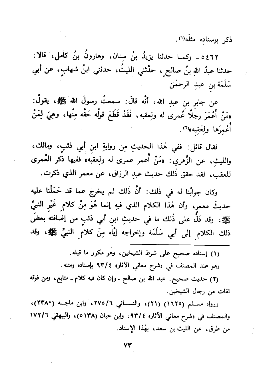 5462 - وَكَمَا حَدَّثَنَا يَزِيدُ بْنُ سِنَانٍ، وَهَارُونُ بْنُ كَامِلٍ قَالَا: حَدَّثَنَا عَبْدُ اللهِ بْنُ صَالِحٍ، حَدَّثَنِي اللَّيْثُ، حَدَّثَنِي ابْنُ شِهَابٍ، عَنْ أَبِي سَلَمَةَ بْنِ عَبْدِ الرَّحْمَنِ، عَنْ جَابِرِ بْنِ عَبْدِ اللهِ، أَنَّهُ قَالَ: سَمِعْتُ رَسُولَ اللهِ صَلَّى اللَّهُ عَلَيْهِ وَسَلَّمَ يَقُولُ: " مَنْ أَعْمَرَ رَجُلًا عُمْرَى لَهُ وَلِعَقِبِهِ، فَقَدْ قَطَعَ قَوْلُهُ حَقَّهُ مِنْهَا، وَهِيَ لِمَنْ أُعْمِرَهَا وَلِعَقِبِهِ " فَقَالَ قَائِلٌ: فَفِي هَذَا الْحَدِيثِ مِنْ رِوَايَةِ ابْنِ أَبِي ذِئْبٍ، وَمَالِكٍ، وَاللَّيْثِ، عَنِ الزُّهْرِيِّ: " مَنْ أُعْمِرَ عُمْرَى لَهُ وَلِعَقِبِهِ "، فَفِيهَا ذِكْرُ الْعُمْرَى لِلْعَقِبِ، فَقَدْ حَقَّقَ ذَلِكَ حَدِيثُ عَبْدِ الرَّزَّاقِ، عَنْ مَعْمَرٍ الَّذِي ذَكَرْتَ. وَكَانَ جَوَابَنَا لَهُ فِي ذَلِكَ: أَنَّ ذَلِكَ لَمْ يَخْرُجَ عَمَّا قَدْ حَمَلْنَا عَلَيْهِ حَدِيثَ مَعْمَرٍ، وَأَنَّ هَذَا الْكَلَامِ الَّذِي فِيهِ إِنَّمَا هُوَ مِنْ كَلَامِ غَيْرِ النَّبِيِّ صَلَّى اللَّهُ عَلَيْهِ وَسَلَّمَ، وَقَدْ دَلَّ عَلَى ذَلِكَ مَا فِي حَدِيثِ ابْنِ أَبِي ذِئْبٍ مِنْ إِضَافَتِهِ بَعْضَ ذَلِكَ الْكَلَامِ إِلَى أَبِي سَلَمَةَ، وَإِخْرَاجِهِ إِيَّاهُ مِنْ كَلَامِ النَّبِيِّ صَلَّى اللَّهُ عَلَيْهِ وَسَلَّمَ. وَقَدْ -[74]- دَلَّ عَلَى ذَلِكَ أَيْضًا مَا قَدْ كَانَ بَيْنَ قَتَادَةَ وَبَيْنَ الزُّهْرِيِّ فِي ذَلِكَ مِنَ الِاخْتِلَافِ فِي الْمَكَانِ الَّذِي اجْتَمَعَا فِيهِ، وَاحْتِجَاجِ قَتَادَةَ عَلَيْهِ فِيهِ بِمَا احْتَجَّ عَلَيْهِ فِيهِ