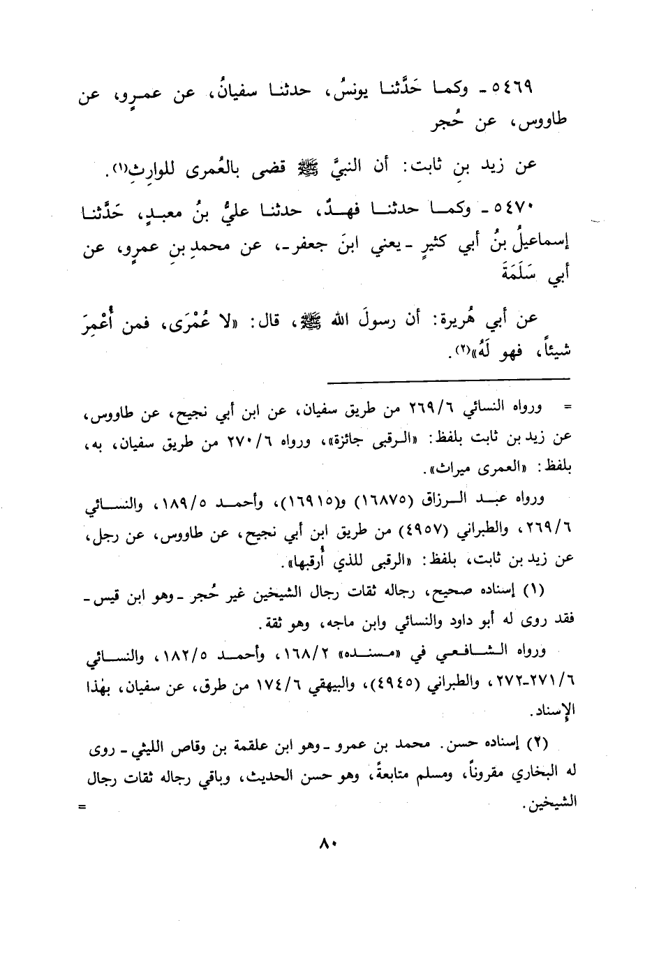 5469 - وَكَمَا حَدَّثَنَا يُونُسُ، حَدَّثَنَا سُفْيَانُ، عَنْ عَمْرٍو، عَنْ طَاوُسٍ، عَنْ حُجْرٍ، عَنْ زَيْدِ بْنِ ثَابِتٍ، " أَنَّ النَّبِيَّ صَلَّى اللَّهُ عَلَيْهِ وَسَلَّمَ قَضَى بِالْعُمْرَى لِلْوَارِثِ "