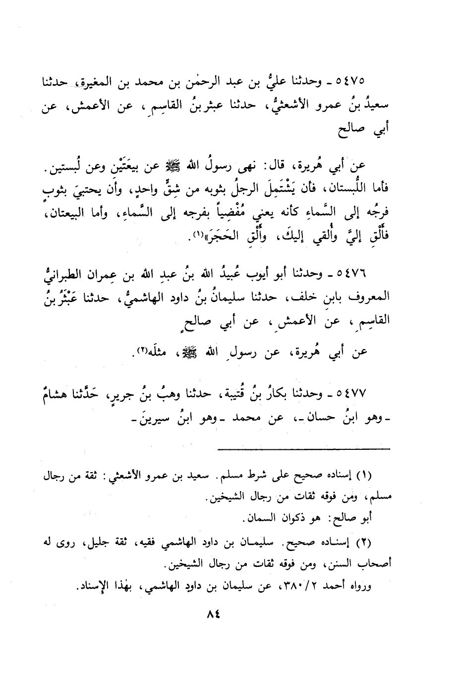 5475 - وَحَدَّثَنَا عَلِيُّ بْنُ عَبْدِ الرَّحْمَنِ بْنِ مُحَمَّدِ بْنِ الْمُغِيرَةِ، حَدَّثَنَا سَعِيدُ بْنُ عَمْرٍو الْأَشْعَثِيُّ، حَدَّثَنَا عَبْثَرُ بْنُ الْقَاسِمِ، عَنِ الْأَعْمَشِ، عَنْ أَبِي صَالِحٍ، عَنْ أَبِي هُرَيْرَةَ قَالَ: " نَهَى رَسُولُ اللهِ صَلَّى اللَّهُ عَلَيْهِ وَسَلَّمَ عَنْ بَيْعَتَيْنِ، وَعَنْ لِبْسَتَيْنِ، فَأَمَّا اللِّبْسَتَانِ: فَأَنْ يَشْتَمِلَ الرَّجُلُ بِثَوْبِهِ مِنْ شِقٍّ وَاحِدٍ، وَأَنْ يَحْتَبِيَ بِثَوْبٍ فَرْجُهُ إِلَى السَّمَاءِ , كَأَنَّهُ يَعْنِي: مُفْضِيًا بِفَرْجِهِ إِلَى السَّمَاءِ، وَأَمَّا الْبَيْعَتَانِ: فَأَلْقِ إِلَيَّ وَأُلْقِي إِلَيْكَ، وَأَلْقِ الْحَجَرَ "