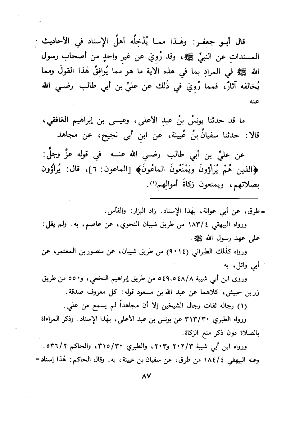 مَا قَدْ حَدَّثَنَا يُونُسُ بْنُ عَبْدِ الْأَعْلَى، وَعِيسَى بْنُ إِبْرَاهِيمَ الْغَافِقِيُّ قَالَا: حَدَّثَنَا سُفْيَانُ بْنُ عُيَيْنَةَ، عَنِ ابْنِ أَبِي نَجِيحٍ، عَنْ مُجَاهِدٍ، عَنْ عَلِيِّ بْنِ أَبِي طَالِبٍ رَضِيَ اللهُ عَنْهُ، فِي قَوْلِهِ عَزَّ وَجَلَّ: " {الَّذِينَ هُمْ يُرَاءُونَ} وَيَمْنَعُونَ الْمَاعُونَ قَالَ: " يُرَاءُونَ بِصَلَاتِهِمْ، وَيَمْنَعُونَ زَكَاةَ أَمْوَالِهِمْ " -[88]- وَمِمَّا رُوِيَ عَنْ عَبْدِ اللهِ بْنِ مَسْعُودٍ مِمَّا لَمْ يُذْكَرْ فِيهِ مَا كَانُوا يَقُولُونَهُ فِي ذَلِكَ عَلَى عَهْدِ رَسُولِ اللهِ صَلَّى اللَّهُ عَلَيْهِ وَسَلَّمَ