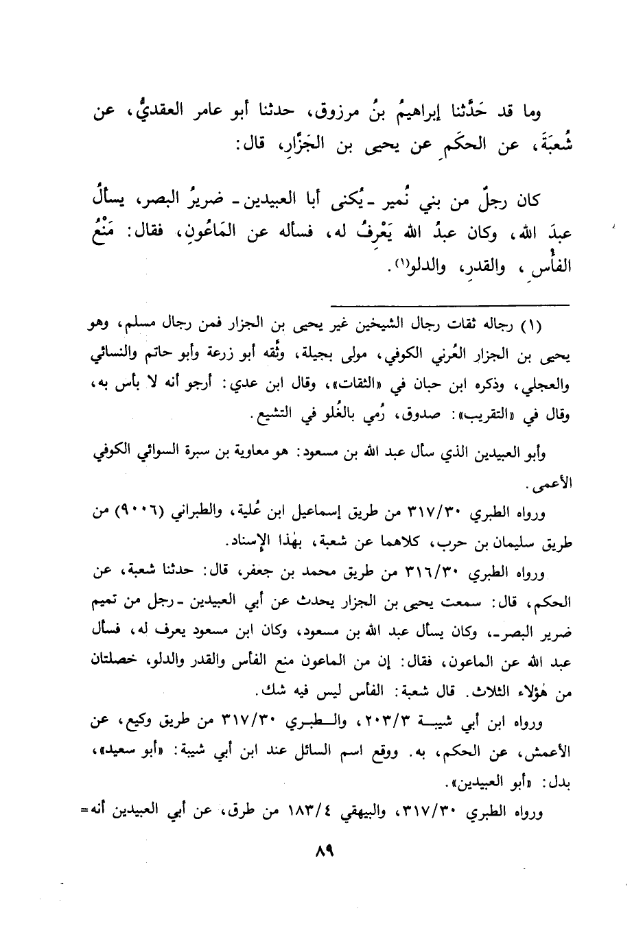 وَمَا قَدْ حَدَّثَنَا إِبْرَاهِيمُ بْنُ مَرْزُوقٍ، حَدَّثَنَا أَبُو عَامِرٍ الْعَقَدِيُّ، عَنْ شُعْبَةَ، عَنِ الْحَكَمِ، عَنْ يَحْيَى بْنِ الْجَزَّارِ قَالَ: كَانَ رَجُلٌ مِنْ بَنِي نُمَيْرٍ - يُكْنَى أَبَا الْعُبَيْدَيْنِ - ضَرِيرُ الْبَصَرِ، يَسْأَلُ عَبْدَ اللهِ، وَكَانَ عَبْدُ اللهِ يَعْرِفُ لَهُ، فَسَأَلَهُ عَنِ الْمَاعُونِ، فَقَالَ: " مَنْعُ الْفَأْسِ، وَالْقِدْرِ، وَالدَّلْوِ " -[90]- وَمِمَّا رُوِيَ عَنْ عَبْدِ اللهِ بْنِ عَبَّاسٍ رَضِيَ اللهُ عَنْهُ