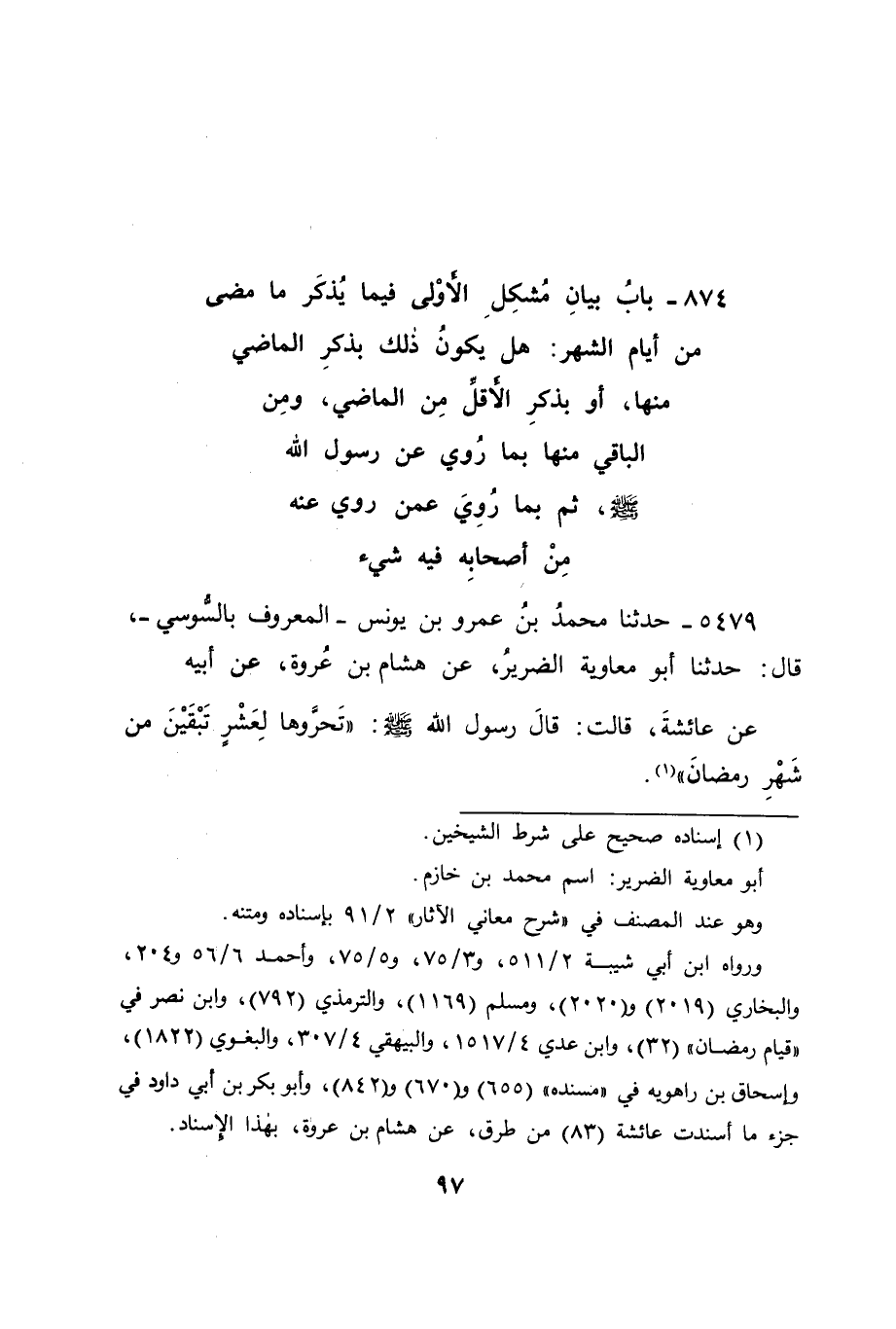 5479 - حَدَّثَنَا مُحَمَّدُ بْنُ عَمْرِو بْنِ يُونُسَ , الْمَعْرُوفُ بِالسُّوسِيِّ قَالَ: حَدَّثَنَا أَبُو مُعَاوِيَةَ الضَّرِيرُ، عَنْ هِشَامِ بْنِ عُرْوَةَ، عَنْ أَبِيهِ، عَنْ عَائِشَةَ قَالَتْ: قَالَ رَسُولُ اللهِ صَلَّى اللَّهُ عَلَيْهِ وَسَلَّمَ: " تَحَرَّوْهَا لِعَشْرٍ تَبَقَّيْنَ مِنْ شَهْرِ رَمَضَانَ " -[98]- فَفِي هَذَا الْحَدِيثِ ذِكْرُ الْبَاقِي مِنَ الشَّهْرِ فِي طَلَبِ لَيْلَةِ الْقِدْرِ فِي لَيْلَةٍ مِنْ لَيَالِي الشَّهْرِ الْمَطْلُوبَةِ فِيهِ، وَقَدْ كَانَ قَوْمٌ مِنْ أَهْلِ الْعِلْمِ مِنْهُمْ: مُحَمَّدُ بْنُ الْعَبَّاسِ اللُّؤْلُؤِيُّ لَا يُؤَرِّخُونَ بِالْبَاقِي مِنَ الشَّهْرِ، وَإِنْ كَانَ قَدْ مَضَى مِنْهُ أَكْثَرُهُ، لِأَنَّهُمْ لَا يَعْلَمُونَ مِقْدَارَ الْبَاقِي مِنْهُ، وَيَحْتَجُّونَ فِي ذَلِكَ بِمَا قَدْ رُوِيَ، عَنْ عَبْدِ اللهِ بْنِ عُمَرَ فِيهِ