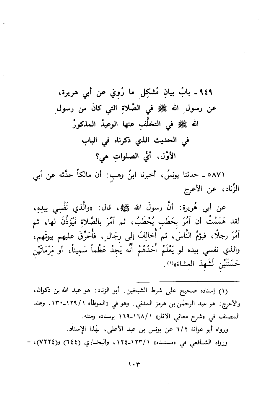 5871 - حَدَّثَنَا يُونُسُ، أَخْبَرَنَا ابْنُ وَهْبٍ، أَنَّ مَالِكًا، حَدَّثَهُ، عَنْ أَبِي الزِّنَادِ، عَنِ الْأَعْرَجِ، عَنْ أَبِي هُرَيْرَةَ أَنَّ رَسُولَ اللهِ صَلَّى اللَّهُ عَلَيْهِ وَسَلَّمَ قَالَ: " وَالَّذِي نَفْسِي بِيَدِهِ، لَقَدْ هَمَمْتُ أَنْ آمُرَ بِحَطَبٍ يُحْطَبُ، ثُمَّ آمُرَ بِالصَّلَاةِ فَيُؤَذَّنَ لَهَا، ثُمَّ آمُرَ رَجُلًا فَيَؤُمَّ النَّاسَ، ثُمَّ أُخَالِفَ إِلَى رِجَالٍ، فَأُحَرِّقَ عَلَيْهِمْ بُيُوتَهُمْ، وَالَّذِي نَفْسِي بِيَدِهِ، لَوْ يَعْلَمُ أَحَدُهُمْ أَنَّهُ يَجِدُ عَظْمًا سَمِينًا، أَوْ مِرْمَاتَيْنِ حَسَنَتَيْنِ لَشَهِدَ الْعِشَاءَ " -[105]-