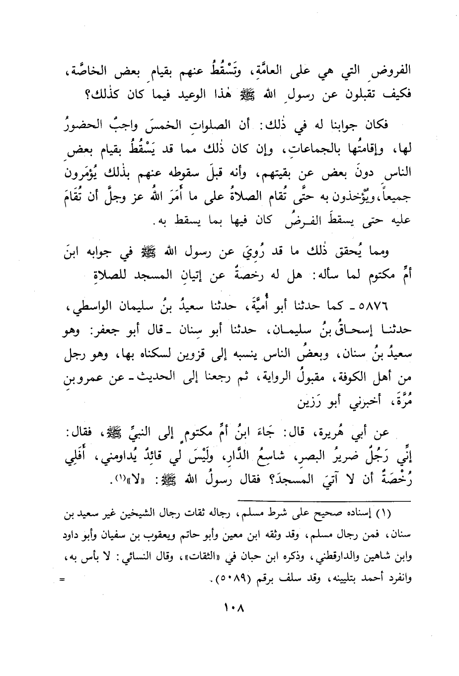 5876 - كَمَا حَدَّثَنَا أَبُو أُمَيَّةَ، حَدَّثَنَا سَعِيدُ بْنُ سُلَيْمَانَ الْوَاسِطِيُّ، حَدَّثَنَا إِسْحَاقُ بْنُ سُلَيْمَانَ، حَدَّثَنَا أَبُو سِنَانٍ قَالَ أَبُو جَعْفَرٍ: وَهُوَ سَعِيدُ بْنُ سِنَانٍ، وَبَعْضُ النَّاسِ يَنْسُبُهُ إِلَى قَزْوِينَ لِسُكْنَاهُ بِهَا، وَهُوَ رَجُلٌ مِنْ أَهْلِ الْكُوفَةِ مَقْبُولُ الرِّوَايَةِ، ثُمَّ رَجَعْنَا إِلَى الْحَدِيثِ عَنْ عَمْرِو بْنِ مُرَّةَ، أَخْبَرَنِي أَبُو رَزِينٍ، عَنْ أَبِي هُرَيْرَةَ قَالَ: جَاءَ ابْنُ أُمِّ مَكْتُومٍ إِلَى النَّبِيِّ صَلَّى اللَّهُ عَلَيْهِ وَسَلَّمَ فَقَالَ: " إِنِّي رَجُلٌ ضَرِيرُ الْبَصَرِ، شَاسِعُ الدَّارِ، وَلَيْسَ لِي قَائِدٌ يُدَاوِمُنِي، أَفَلِي رُخْصَةٌ أَنْ لَا آتِيَ الْمَسْجِدَ؟ فَقَالَ رَسُولُ اللهِ صَلَّى اللَّهُ عَلَيْهِ وَسَلَّمَ: " لَا " -[109]- هَكَذَا رَوَى أَبُو سِنَانٍ هَذَا الْحَدِيثَ، عَنْ عَمْرِو بْنِ مُرَّةَ وَرَوَاهُ شُعْبَةُ عَنْ عَمْرِو بْنِ مُرَّةَ، فَخَالَفَهُ فِي إِسْنَادِهِ