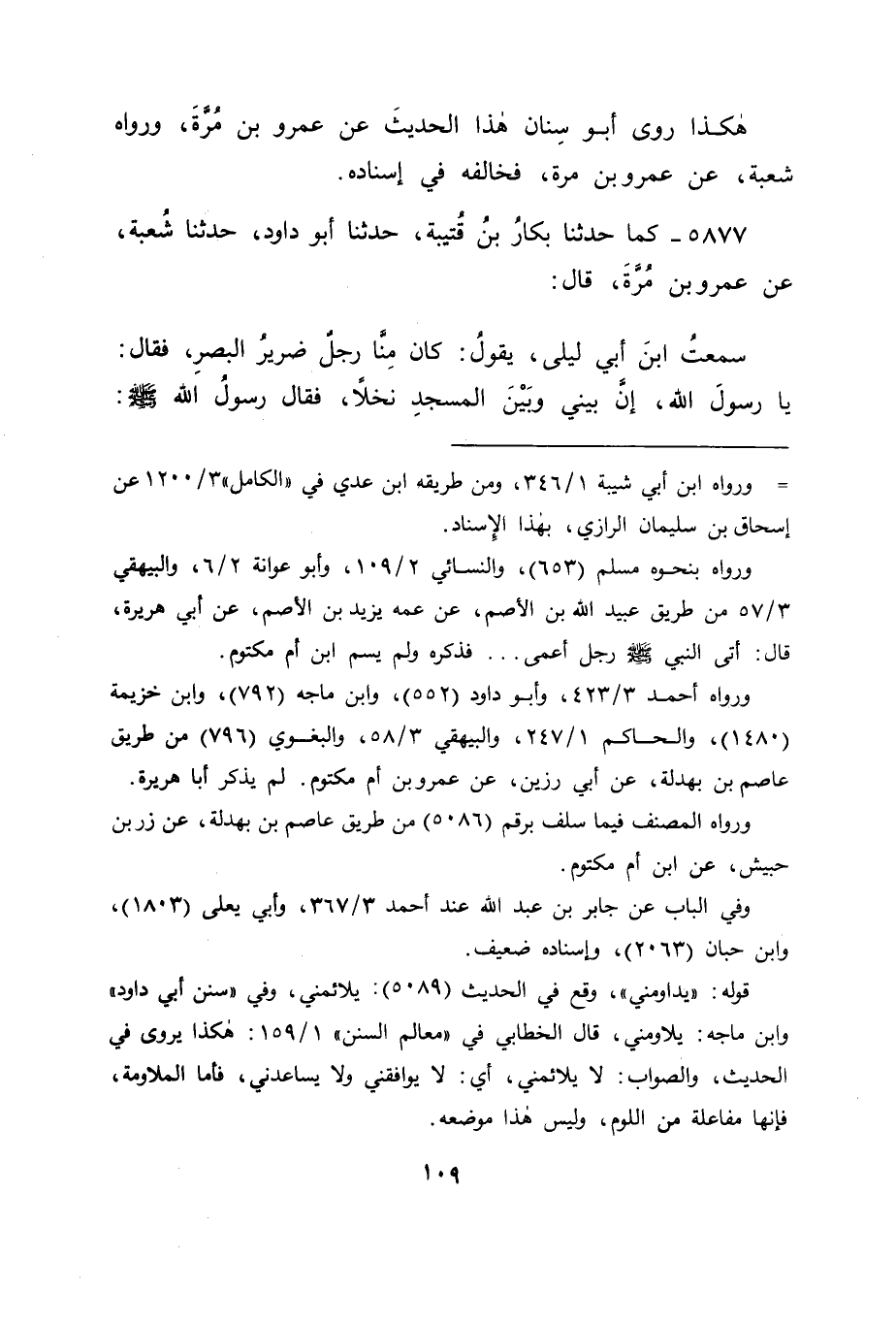 5877 - كَمَا حَدَّثَنَا بَكَّارُ بْنُ قُتَيْبَةَ، حَدَّثَنَا أَبُو دَاوُدَ، حَدَّثَنَا شُعْبَةُ، عَنْ عَمْرِو بْنِ مُرَّةَ قَالَ: سَمِعْتُ ابْنَ أَبِي لَيْلَى يَقُولُ: كَانَ مِنَّا رَجُلٌ ضَرِيرُ الْبَصَرِ فَقَالَ: يَا رَسُولَ اللهِ، إِنَّ بَيْنِي وَبَيْنَ الْمَسْجِدِ نَخْلًا، فَقَالَ رَسُولُ اللهِ صَلَّى اللَّهُ عَلَيْهِ وَسَلَّمَ: " -[110]- أَتَسْمَعُ النِّدَاءَ "؟ قَالَ: نَعَمْ، قَالَ: " فَإِذَا سَمِعْتَ النِّدَاءَ فَأَجِبْهُ " غَيْرَ أَنَّا تَأَمَّلْنَا هَذَا الْحَدِيثَ، فَوَجَدْنَا ابْنَ أَبِي لَيْلَى يَقُولُ فِيهِ: كَانَ مِنَّا رَجُلٌ ضَرِيرُ الْبَصَرِ، وَابْنُ أَبِي لَيْلَى مِنَ الْأَنْصَارِ، وَابْنُ أُمِّ مَكْتُومٍ فَمِنْ قُرَيْشٍ، فَاحْتُمِلَ أَنْ يَكُونَ ذَلِكَ عَلَى رَجُلٍ مِنَ الْأَنْصَارِ، فَيَكُونُ مَا فِي حَدِيثِهِ هَذَا غَيْرَ مَا فِي الْحَدِيثِ الْأَوَّلِ، فَيَكُونُ كُلُّ وَاحِدٍ مِنَ الرَّجُلَيْنِ الْمَذْكُورَيْنِ فِيهِمَا غَيْرَ الْآخَرِ
