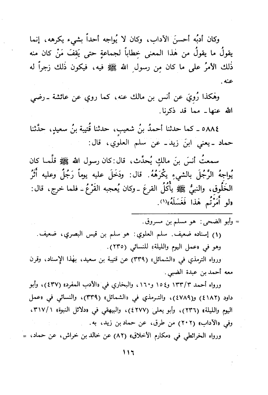 5884 - كَمَا حَدَّثَنَا أَحْمَدُ بْنُ شُعَيْبٍ، حَدَّثَنَا قُتَيْبَةُ بْنُ سَعِيدٍ، حَدَّثَنَا حَمَّادٌ يَعْنِي ابْنَ زَيْدٍ، عَنْ سَلْمٍ الْعَلَوِيِّ قَالَ: سَمِعْتُ أَنَسَ بْنَ مَالِكٍ يُحَدِّثُ قَالَ: كَانَ رَسُولُ اللهِ صَلَّى اللَّهُ عَلَيْهِ وَسَلَّمَ قَلَّمَا كَانَ يُوَاجِهُ الرَّجُلَ بِالشَّيْءِ يَكْرَهُهُ. قَالَ: وَدَخَلَ عَلَيْهِ يَوْمًا رَجُلٌ وَعَلَيْهِ أَثَرُ الْخَلُوقِ، وَالنَّبِيُّ صَلَّى اللَّهُ عَلَيْهِ وَسَلَّمَ يَأْكُلُ الْقَرْعَ، وَكَانَ يُعْجِبُهُ الْقَرْعُ، فَلَمَّا خَرَجَ قَالَ: " لَوْ أَمَرْتُمْ هَذَا فَغَسَلَهُ " -[117]- فَكَانَ الَّذِي كَانَ مِنْهُ فِي الْمُتَخَلِّفِينَ عَنِ الْجَمَاعَةِ مِنْ هَذَا الْجِنْسِ، وَاللهُ أَعْلَمُ بِمُرَادِهِ صَلَّى اللَّهُ عَلَيْهِ وَسَلَّمَ كَانَ فِي ذَلِكَ. فَقَالَ قَائِلٌ: فَفِيمَا رُوِّيتُمْ أَنَّهُ خَاطَبَهُ بِخِطَابٍ عَنْ أَفْعَالِ جَمَاعَةٍ، أَوْ عَنْ أَحْوَالِ جَمَاعَةٍ، وَإِنَّمَا كَانَ ذَلِكَ عَنْ رَجُلٍ وَاحِدٍ، أَفَيَجُوزُ أَنْ يُضَافَ مَا كَانَ مِنَ الْوَاحِدِ إِلَى الْجَمَاعَةِ؟ فَكَانَ جَوَابُنَا لَهُ فِي ذَلِكَ: أَنَّ هَذَا مِمَّا قَدْ يَجُوزُ أَنْ يُضَافَ إِلَى الْجَمَاعَةِ، فَيَكُونُ مَا أُرِيدُ ذَلِكَ الْقَوْلُ مِنْ أَجَلِهِ مِنْ وَاحِدٍ مِنْهُمْ، وَقَدْ جَاءَ الْقُرْآنُ بِمِثْلِ هَذَا، وَهُوَ قَوْلُهُ عَزَّ وَجَلَّ لِنَبِيِّهِ صَلَّى اللَّهُ عَلَيْهِ وَسَلَّمَ بِمَا كَانَ مِنْ عَبْدِ اللهِ بْنِ أُبَيٍّ مِنْ قَوْلِهِ: {لَئِنْ رَجَعْنَا إِلَى الْمَدِينَةِ لَيُخْرِجَنَّ الْأَعَزُّ مِنْهَا الْأَذَلَّ} [المنافقون: 8] فَقَالَ عَزَّ وَجَلَّ: {هُمُ الَّذِينَ يَقُولُونَ} [المنافقون: 7] ، وَالْقَوْلُ كَانَ مِنْ وَاحِدٍ مِنْهُمْ، وَهُوَ عَبْدُ اللهِ بْنُ أُبَيِّ ابْنِ سَلُولٍ