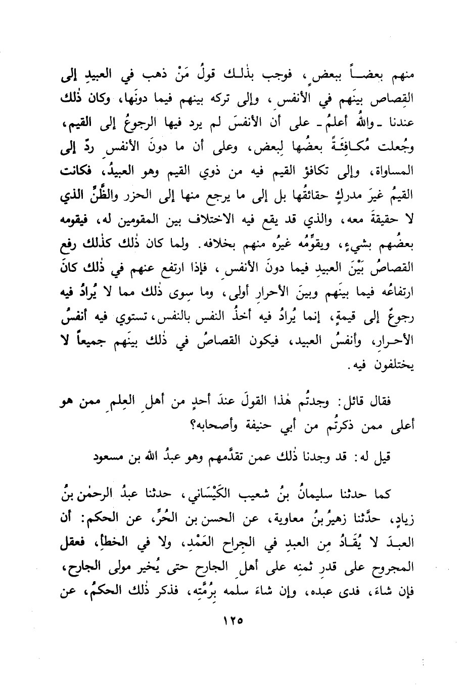كَمَا حَدَّثَنَا سُلَيْمَانُ بْنُ شُعَيْبٍ الْكَيْسَانِيُّ، حَدَّثَنَا عَبْدُ الرَّحْمَنِ بْنُ زِيَادٍ، حَدَّثَنَا زُهَيْرُ بْنُ مُعَاوِيَةَ، عَنِ الْحَسَنِ بْنِ الْحُرِّ، عَنِ الْحَكَمِ: " أَنَّ الْعَبْدَ لَا يُقَادُ مِنَ الْعَبْدِ فِي الْجِرَاحِ الْعَمْدِ، وَلَا فِي الْخَطَأِ، فَعَقْلُ الْمَجْرُوحِ عَلَى قَدْرِ ثَمَنِهِ عَلَى أَهْلِ الْجَارِحِ، حَتَّى يُخَيَّرَ مَوْلَى الْجَارِحِ، فَإِنْ شَاءَ فَدَى عَبْدَهُ، وَإِنْ شَاءَ سَلَّمَهُ بِرُمَّتِهِ " فَذَكَرَ ذَلِكَ الْحَكَمُ عَنْ -[126]- إِبْرَاهِيمَ، وَالشَّعْبِيِّ، عَنْ عَبْدِ اللهِ بْنِ مَسْعُودٍ. وَذَلِكَ أَنَّهُ جَعَلَهُ مَالًا، فَدَلَّ ذَلِكَ أَنَّ مَذْهَبَ عَبْدِ اللهِ كَانَ أَنَّ مَا دُونَ النَّفْسِ مِنَ الْعَبِيدِ يُرَدُّ إِلَى الْمَالِ الَّذِي يُرَادُ فِيهِ التَّكَافُؤُ فِي الْقِيَمِ، وَأَنَّهُمْ فِي الْأَنْفُسِ كَمَنْ سِوَاهُمْ مِنَ الْأَحْرَارِ، وَلَا يُرْجَعُ فِي ذَلِكَ إِلَى قِيمَةٍ، وَلَا إِلَى مَا سِوَاهَا. فَإِنْ قَالَ قَائِلٌ: فَإِبْرَاهِيمُ وَالشَّعْبِيُّ لَمْ يَلْقَيَا عَبْدَ اللهِ؟ كَانَ جَوَابُنَا لَهُ فِي ذَلِكَ: أَنَّ إِبْرَاهِيمَ قَدْ رُوِّينَا عَنْهُ فِيمَا تَقَدَّمَ مِنْ كِتَابِنَا هَذَا أَنَّهُ قَالَ لِلْأَعْمَشِ لَمَّا قَالَ لَهُ: إِذَا حَدَّثْتَنِي فَأَسْنِدْ، فَقَالَ لَهُ: إِذَا قُلْتُ: قَالَ عَبْدُ اللهِ، فَلَمْ أَقُلْ ذَلِكَ حَتَّى حَدَّثَنِيهِ جَمَاعَةٌ عَنْهُ، وَإِذَا قُلْتُ: حَدَّثَنِي فُلَانٌ، عَنْ عَبْدِ اللهِ، فَهُوَ الَّذِي حَدَّثَنِي، فَأَخْبَرَ إِبْرَاهِيمُ بِذَلِكَ بِأَنَّ مَا لَا يَذْكُرُ فِيهِ مَنْ بَيْنَهُ وَبَيْنَ عَبْدِ اللهِ أَقْوَى مِمَّا يَذْكُرُهُ عَنْ رَجُلٍ بِعَيْنِهِ، عَنْ عَبْدِ اللهِ، وَاللهُ أَعْلَمُ