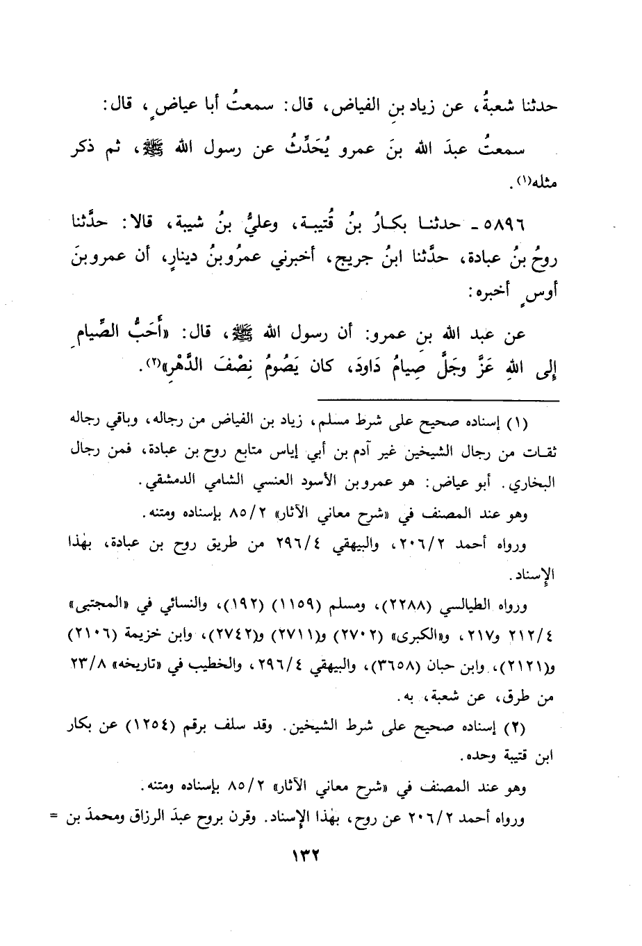 5896 - حَدَّثَنَا بَكَّارُ بْنُ قُتَيْبَةَ، وَعَلِيُّ بْنُ شَيْبَةَ قَالَا: حَدَّثَنَا رَوْحُ بْنُ عُبَادَةَ، حَدَّثَنَا ابْنُ جُرَيْجٍ، أَخْبَرَنِي عَمْرُو بْنُ دِينَارٍ، أَنَّ عَمْرَو بْنَ أَوْسٍ، أَخْبَرَهُ عَنْ عَبْدِ اللهِ بْنِ عَمْرٍو، أَنَّ رَسُولَ اللهِ صَلَّى اللَّهُ عَلَيْهِ وَسَلَّمَ قَالَ: " أَحَبُّ الصِّيَامِ إِلَى اللهِ عَزَّ وَجَلَّ صِيَامُ دَاوُدَ، كَانَ يَصُومُ نِصْفَ الدَّهْرِ " -[133]- فَقَالَ قَائِلٌ: فَفِي الْحَدِيثِ أَنَّ صَوْمَ دَاوُدَ كَانَ أَحَبَّ الصِّيَامِ إِلَى اللهِ عَزَّ وَجَلَّ، وَفِيهِ الزِّيَادَةُ عَلَى الصِّيَامِ الْمَذْكُورِ فِي الْحَدِيثِ الَّذِي فِي الْبَابِ الَّذِي قَبْلَ هَذَا الْبَابِ فَكَانَ جَوَابُنَا لَهُ فِي ذَلِكَ: أَنَّهُ لَا خِلَافَ بَيْنَ مَا فِي هَذَا الْحَدِيثِ وَبَيْنَ مَا فِي الْحَدِيثِ الَّذِي رُوِّينَاهُ فِي الْبَابِ الْأَوَّلِ، لِأَنَّ الَّذِي فِي الْحَدِيثِ إِنَّمَا هُوَ إِخْبَارٌ عَنْ صَوْمِ دَاوُدَ عَلَيْهِ السَّلَامُ، وَهُوَ وَمَنْ سِوَاهُ مِنَ الْأَنْبِيَاءِ مَحْمُولٌ عَنْهُمْ فِي صِيَامِهِمْ مَا لَيْسَ بِمَحْمُولٍ عَمَّنْ سِوَاهُمْ، أَلَا تَرَى إِلَى مَا رَوَوْا عَنْ رَسُولِ اللهِ صَلَّى اللَّهُ عَلَيْهِ وَسَلَّمَ فِي مُوَاصَلَتِهِ الصِّيَامَ بَعْدَ نَهْيِهِ النَّاسَ عَنْ مِثْلِ ذَلِكَ، وَبَيَانِهِ لَهُمْ أَنَّهُ فِي ذَلِكَ بِخِلَافِهِمْ، وَأَنَّهُ يُطْعَمُ وَيُسْقَى، وَلَيْسُوا كَذَلِكَ؟