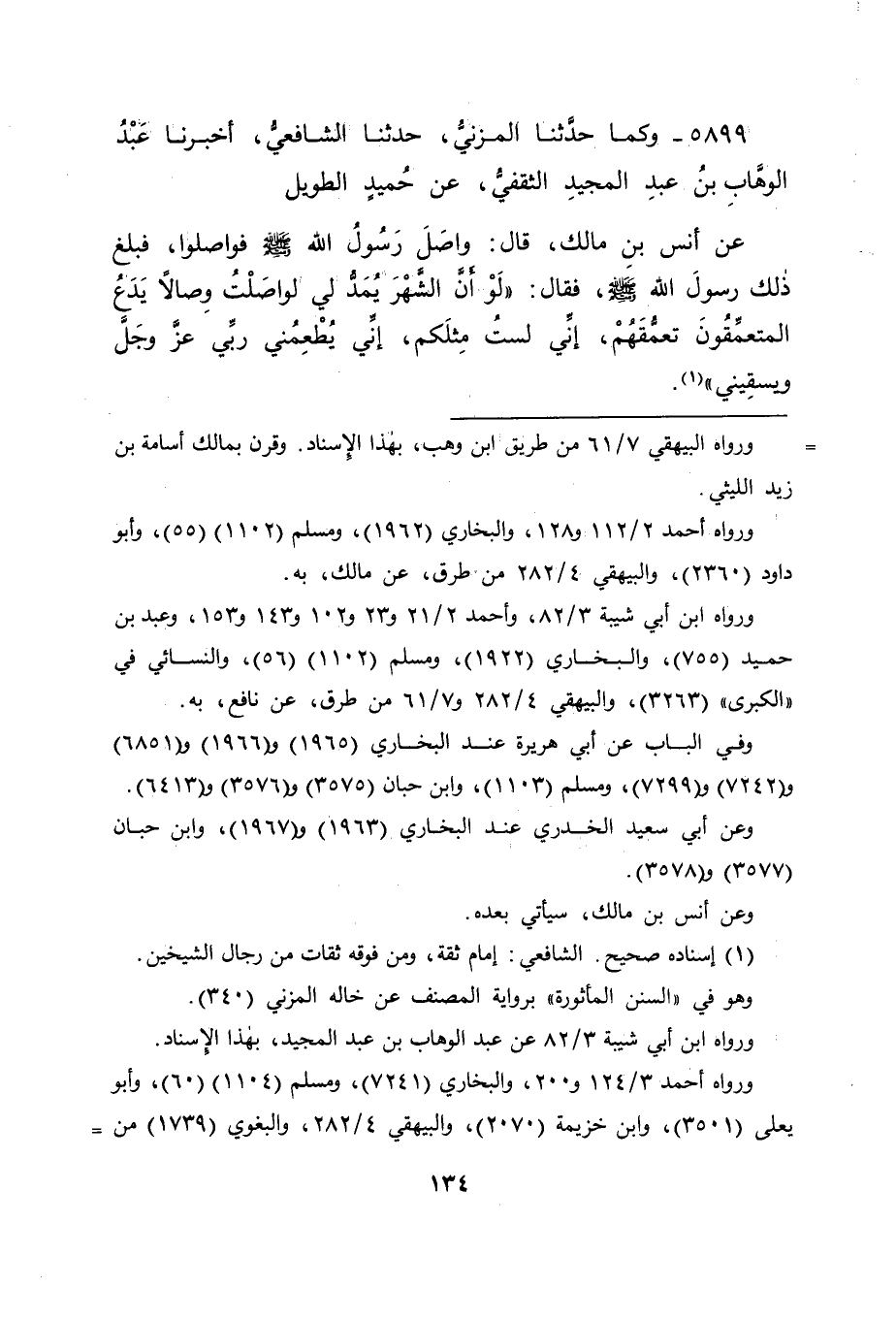 5899 - وَكَمَا حَدَّثَنَا الْمُزَنِيُّ، حَدَّثَنَا الشَّافِعِيُّ، أَخْبَرَنَا عَبْدُ الْوَهَّابِ بْنُ عَبْدِ الْمَجِيدِ الثَّقَفِيُّ، عَنْ حُمَيْدٍ الطَّوِيلِ، عَنْ أَنَسِ بْنِ مَالِكٍ قَالَ: وَاصَلَ رَسُولُ اللهِ صَلَّى اللَّهُ عَلَيْهِ وَسَلَّمَ فَوَاصَلُوا، فَبَلَغَ ذَلِكَ رَسُولَ اللهِ صَلَّى اللَّهُ عَلَيْهِ وَسَلَّمَ فَقَالَ: " لَوْ أَنَّ الشَّهْرَ يُمَدُّ لِي لَوَاصَلْتُ وِصَالًا يَدَعُ الْمُتَعَمِّقُونَ تَعَمُّقَهُمْ، إِنِّي لَسْتُ مِثْلَكُمْ، إِنِّي يُطْعِمُنِي رَبِّي عَزَّ وَجَلَّ وَيَسْقِينِي " -[135]- أَوَلَا تَرَى أَنَّ رَسُولَ اللهِ صَلَّى اللَّهُ عَلَيْهِ وَسَلَّمَ قَدْ كَانَ مَحْمُولًا عَنْهُ فِي صِيَامِهِ مِمَّا لَيْسَ مَحْمُولًا عَمَّنْ سِوَاهُ مِنْ أُمَّتِهِ؟ فَكَانَ يُغْنَى بِذَلِكَ عَنِ الْإِفْطَارِ الَّذِي لَا يُغْنَى غَيْرُهُ مِنْ أُمَّتِهِ عَنْهُ، وَكَانَ مِنْ أَجْلِ ذَلِكَ يُوَاصِلُ الْوِصَالَ الَّذِي كَانَ يُوَاصِلُهُ مِمَّا هُوَ مُبَاحٌ لَهُ لِلْمَعْنَى الَّذِي مَعَهُ مِمَّا لَيْسَ مَعَ غَيْرِهِ، فَكَانَ غَيْرُهُ فِي ذَلِكَ مَذْمُومًا، وَكَانَ هُوَ صَلَّى الله عَلَيْهِ مَحْمُودًا، فَكَانَ دَاوُدُ، صَلَوَاتُ اللهِ عَلَيْهِ، فِي صَوْمِهِ كَذَلِكَ، وَكَانَ مِنْ أَجْلِ ذَلِكَ حَمِدَ اللهُ مِنْهُ صَوْمَهُ الَّذِي كَانَ يَصُومُهُ. وَمِمَّا يَدُلُّ عَلَى هَذَا الْمَعْنَى أَيْضًا، وَيُوجِبُ تَفْضِيلَ قَلِيلِ الصِّيَامِ عَلَى كَثِيرِهِ بَعْدَ أَنْ يَكُونَ مَعَ قَلِيلِهِ الْأَسْبَابُ الْمُتَقَرَّبُ بِهَا إِلَى اللهِ سُبْحَانَهُ