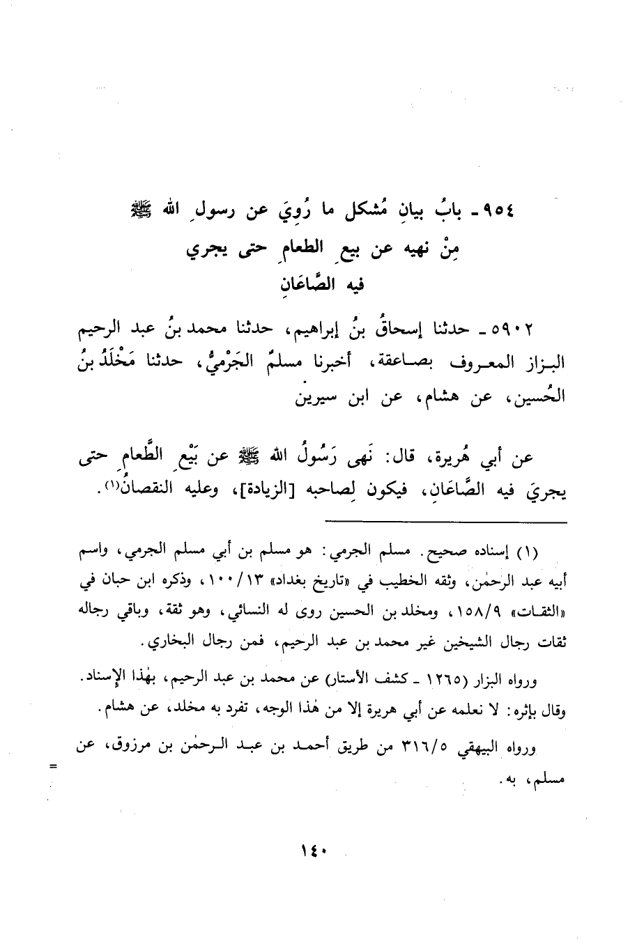 5902 - حَدَّثَنَا إِسْحَاقُ بْنُ إِبْرَاهِيمَ، حَدَّثَنَا مُحَمَّدُ بْنُ عَبْدِ الرَّحِيمِ الْبَزَّازُ الْمَعْرُوفُ بِصَاعِقَةَ، أَخْبَرَنَا مُسْلِمٌ الْجَرْمِيُّ، حَدَّثَنَا مَخْلَدُ بْنُ الْحُسَيْنِ، عَنْ هِشَامٍ، عَنِ ابْنِ سِيرِينَ، عَنْ أَبِي هُرَيْرَةَ، قَالَ: " نَهَى رَسُولُ اللهِ صَلَّى اللَّهُ عَلَيْهِ وَسَلَّمَ عَنْ بَيْعِ الطَّعَامِ حَتَّى يَجْرِيَ فِيهِ الصَّاعَانِ، فَيَكُونَ لِصَاحِبِهِ الزِّيَادَةُ، وَعَلَيْهِ النُّقْصَانُ " -[141]- قَالَ أَبُو جَعْفَرٍ: فَتَأَمَّلْنَا هَذَا الْحَدِيثَ، فَكَانَ أَحْسَنَ مَا حَضَرَنَا فِيهِ أَنْ يَكُونَ ذَلِكَ أُرِيدَ بِهِ اكْتِيَالُ مُبْتَاعِ الطَّعَامِ بَعْدَ ابْتِيَاعِهِ إِيَّاهُ مِمَّنْ كَانَ بَاعَهُ إِيَّاهُ قَبْلَ ذَلِكَ، ثُمَّ كَانَ بَيْعُهُ إِيَّاهُ مِنْ مُبْتَاعٍ سِوَاهُ كَيْلًا، فَكَانَ الْبَيْعُ لَا يَحِلُّ لِذَلِكَ الْمُبْتَاعِ فِي ذَلِكَ الطَّعَامِ حَتَّى يَكْتَالَ مِنْهُ الِاكْتِيَالَ الَّذِي يَجِبُ لَهُ عَلَيْهِ بِحَقِّ الْبَيْعِ الَّذِي بَيْنَهُ وَبَيْنَهُ مِمَّا قَدْ تَقَدَّمَ اكْتِيَالُ بَائِعِهِ إِيَّاهُ مِنَ الْبَائِعِ الَّذِي كَانَ بَاعَهُ إِيَّاهُ قَبْلَ بَيْعِهِ إِيَّاهُ ذَلِكَ الْبَيْعَ الثَّانِي، فَيَكُونُ الْبَيْعُ لَا يَحِلُّ لِلْمُبْتَاعِ الثَّانِي فِيمَا قَدِ ابْتَاعَهُ مِنَ الْبَائِعِ الَّذِي كَانَ -[142]- ابْتَاعَهُ كَيْلًا إِلَّا بَعْدَ أَنْ يَتَقَدَّمَهُ الِاكْتِيَالِانِ بِالصَّاعِ الَّذِي يُكَالُ بِهِ ذَلِكَ الطَّعَامُ. فَإِنْ قَالَ قَائِلٌ: وَلِمَ احْتِيجَ إِلَى ذِكْرِ مَا كَانَ بَيْنَ الْبَائِعِ وَبَائِعِهِ فِي هَذَا الطَّعَامِ، وَقَدْ يَجُوزُ أَنْ يَكُونَ ذَلِكَ الطَّعَامُ قَدْ صَارَ إِلَيْهِ بِمَا لَا اكْتِيَالَ لَهُ فِيهِ، مِنْ وَاهِبٍ لَهُ ذَلِكَ الطَّعَامَ، أَوْ مُتَصَدِّقٍ عَلَيْهِ بِهِ؟ فَكَانَ جَوَابُنَا لَهُ فِي ذَلِكَ: أَنَّ الْقَوْمَ كَانُوا تُجَّارًا يَبْتَاعُونَ وَيَبِيعُونَ، فَخُوطِبُوا فِي ذَلِكَ بِمَا خُوطِبُوا بِهِ مِنْ هَذَا الْحَدِيثِ إِيجَازًا مِنَ الْمُخَاطِبِ لَهُمْ بِهِ صَلَّى اللَّهُ عَلَيْهِ وَسَلَّمَ، لِأَنَّهُمْ عَلِمُوا بِذَلِكَ الْحُكْمَ فِي بَيْعَيْنِ يُوجِبُ كُلُّ وَاحِدٍ مِنْهُمَا اكْتِيَالًا غَيْرَ الِاكْتِيَالِ الَّذِي يُوجِبُ الْبَيْعُ الْآخَرُ مِنْ ذَيْنِكَ الْبَيْعَيْنِ، وَلَوْ خَاطَبَهُمْ بِذَلِكَ فِي الْبَيْعِ الْآخَرِ مِنْ ذَيْنِكَ الْبَيْعَيْنِ لَمَا عَلِمُوا بِذَلِكَ حُكْمَ الْبَيْعِ الْأَوَّلِ مِنْهُمَا، وَقَدْ زَادَهُمْ صَلَّى اللَّهُ عَلَيْهِ وَسَلَّمَ مَعْنًى حَسَنًا مِمَّا يَحْتَاجُ الْفُقَهَاءُ إِلَيْهِ فِي هَذَا الْمَعْنَى، وَهُوَ أَنَّ الزِّيَادَةَ الَّتِي تَكُونُ فِي الْكَيْلِ الثَّانِي عَلَى الْكَيْلِ الْأَوَّلِ تَكُونُ لِلْبَائِعِ، وَلَا يَمْنَعُهُ مِنْ ذَلِكَ دُخُولُهُمَا فِيمَا كِيلَ لَهُ بِالِاكْتِيَالِ الْأَوَّلِ. وَفِي ذَلِكَ مَا قَدْ يَدُلُّ عَلَى أَنَّ مَا يَجْرِي بَيْنَ النَّاسِ مِمَّا يَسْتَعْمِلُونَ فِيهِ الْكَيْلَ قَدْ يَقَعُ فِيهِ بَيْنَهُمُ اخْتِلَافٌ، وَيَزِيدُ بَعْضُهُمْ فِيهِ عَلَى بَعْضٍ، وَيُنْقِصُ بَعْضُهُمْ عَمَّا كَانَ غَيْرُهُمْ يَتَجَاوَزُ بِهِ فِيهِ، وَإِنَّ ذَلِكَ لَا يَمْنَعُ مِنِ اسْتِعْمَالِهِ إِذْ كَانَ رَأْيًا كَمَا تُسْتَعْمَلُ الْآرَاءُ فِي الْحَوَادِثِ فِي أُمُورِ الدِّينِ مِمَّا لَا تَوْقِيفَ فِيهَا، وَلَا يَمْنَعُ ذَلِكَ وُقُوعُ الِاخْتِلَافِ بَيْنَ الْعُلَمَاءِ فِيهَا، وَاللهُ أَعْلَمُ