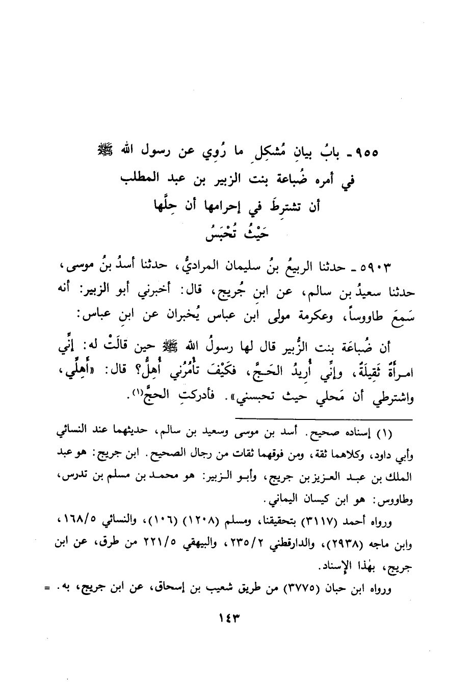 5903 - حَدَّثَنَا الرَّبِيعُ بْنُ سُلَيْمَانَ الْمُرَادِيُّ، حَدَّثَنَا أَسَدُ بْنُ مُوسَى، حَدَّثَنَا سَعِيدُ بْنُ سَالِمٍ، عَنِ ابْنِ جُرَيْجٍ قَالَ: أَخْبَرَنِي أَبُو الزُّبَيْرِ، أَنَّهُ سَمِعَ طَاوُسًا، وَعِكْرِمَةَ مَوْلَى ابْنِ عَبَّاسٍ، يُخْبِرَانِ عَنِ ابْنِ عَبَّاسٍ، أَنَّ ضُبَاعَةَ بِنْتَ الزُّبَيْرِ، قَالَ لَهَا رَسُولُ اللهِ صَلَّى اللَّهُ عَلَيْهِ وَسَلَّمَ حِينَ قَالَتْ لَهُ: إِنِّي امْرَأَةٌ ثَقِيلَةٌ، وَإِنِّي أُرِيدُ الْحَجَّ، فَكَيْفَ تَأْمُرُنِي أُهِلُّ؟ قَالَ " أَهِلِّي، وَاشْتَرِطِي أَنَّ مَحِلِّي حَيْثُ تَحْبِسُنِي " فَأَدْرَكَتِ الْحَجَّ " -[144]-