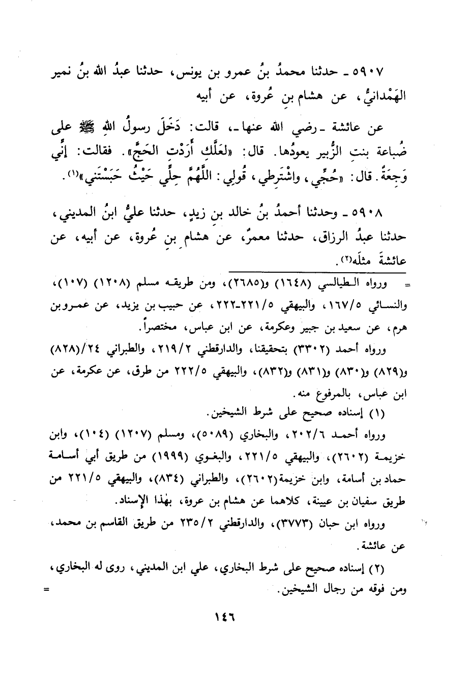 5907 - حَدَّثَنَا مُحَمَّدُ بْنُ عَمْرِو بْنِ يُونُسَ، حَدَّثَنَا عَبْدُ اللهِ بْنُ نُمَيْرٍ الْهَمْدَانِيُّ، عَنْ هِشَامِ بْنِ عُرْوَةَ، عَنْ أَبِيهِ، عَنْ عَائِشَةَ رَضِيَ اللهُ عَنْهَا قَالَتْ: دَخَلَ رَسُولُ اللهِ صَلَّى اللَّهُ عَلَيْهِ وَسَلَّمَ عَلَى ضُبَاعَةَ بِنْتِ الزُّبَيْرِ يَعُودُهَا. قَالَ: " لَعَلَّكِ أَرَدْتِ الْحَجَّ ". فَقَالَتْ: إِنِّي وَجِعَةٌ. قَالَ: " حُجِّي وَاشْتَرِطِي، قُولِي: اللهُمَّ حِلِّي حَيْثُ حَبَسْتَنِي "