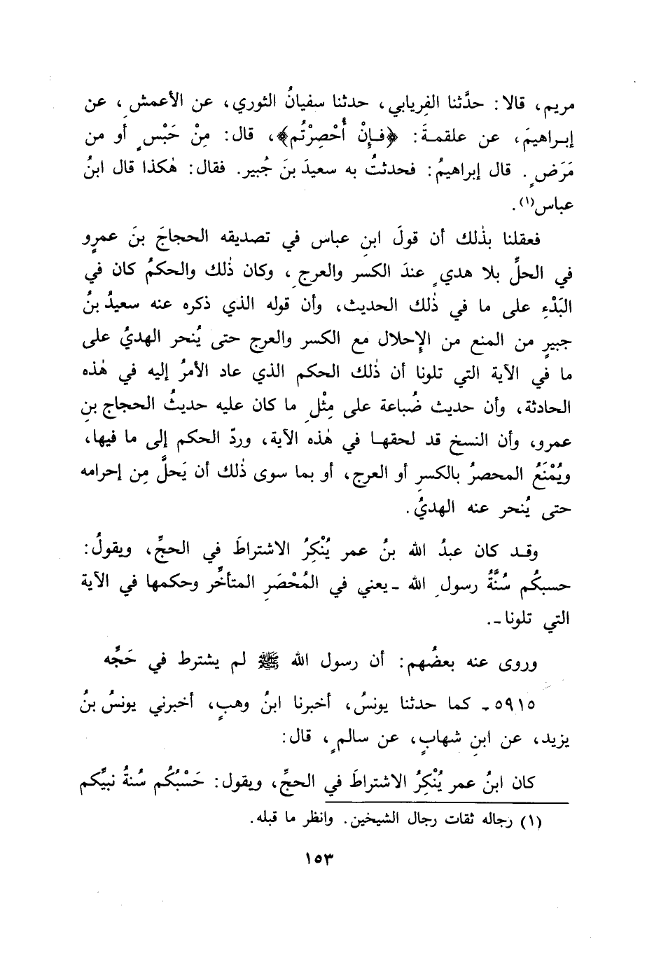 5915 - كَمَا حَدَّثَنَا يُونُسُ، أَخْبَرَنَا ابْنُ وَهْبٍ، أَخْبَرَنِي يُونُسُ بْنُ يَزِيدَ، عَنِ ابْنِ شِهَابٍ، عَنْ سَالِمٍ قَالَ: كَانَ ابْنُ عُمَرَ يُنْكِرُ الِاشْتِرَاطَ فِي الْحَجِّ، وَيَقُولُ: حَسْبُكُمْ سُنَّةُ نَبِيِّكُمْ صَلَّى اللَّهُ عَلَيْهِ وَسَلَّمَ: " -[154]- إِنْ حُبِسَ أَحَدُكُمْ طَافَ بِالْبَيْتِ، وَبِالصَّفَا وَالْمَرْوَةِ، ثُمَّ حَلَّ مِنْ كُلِّ شَيْءٍ حَتَّى يَحُجَّ عَامًا قَابِلًا، وَيُهْدِي أَوْ يَصُومُ "