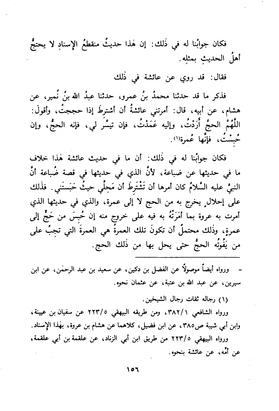 فَذَكَرَ مَا قَدْ حَدَّثَنَا مُحَمَّدُ بْنُ عَمْرٍو، حَدَّثَنَا عَبْدُ اللهِ بْنُ نُمَيْرٍ، عَنْ هِشَامٍ، عَنْ أَبِيهِ قَالَ: أَمَرَتْنِي عَائِشَةُ أَنْ أَشْتَرِطَ إِذَا حَجَجْتُ، وَأَقُولُ: " اللهُمَّ الْحَجَّ أَرَدْتُ، وَإِلَيْهِ عَمَدْتُ، فَإِنْ تَيَسَّرَ لِي فَإِنَّهُ الْحَجُّ، وَإِنْ حُبِسْتُ فَإِنَّهَا عُمْرَةٌ " فَكَانَ جَوَابُنَا لَهُ فِي ذَلِكَ: أَنَّ مَا فِي حَدِيثِ عَائِشَةَ هَذَا خِلَافُ مَا فِي حَدِيثِهَا عَنْ ضُبَاعَةَ، لِأَنَّ الَّذِي فِي حَدِيثِهَا فِي قِصَّةِ ضُبَاعَةَ أَنَّ النَّبِيَّ عَلَيْهِ السَّلَامُ كَانَ أَمَرَهَا أَنْ تَشْتَرِطَ: أَنَّ مَحِلِّي حَيْثُ حَبَسْتَنِي. فَذَلِكَ عَلَى إِحْلَالٍ يُخْرَجُ بِهِ مِنَ الْحَجِّ، لَا إِلَى عُمْرَةٍ، وَالَّذِي فِي حَدِيثِهَا الَّذِي أَمَرَتْ بِهِ عُرْوَةَ بِمَا أَمَرَتْهُ بِهِ فِيهِ عَلَى خُرُوجٍ مِنْهُ إِنْ حُبِسَ مِنْ حَجٍّ إِلَى عُمْرَةٍ، وَذَلِكَ مُحْتَمِلٌ أَنْ تَكُونَ تِلْكَ الْعُمْرَةُ هِيَ الْعُمْرَةُ الَّتِي تَجِبُ عَلَى مَنْ يَفُوتُهُ الْحَجُّ حَتَّى يَحِلَّ بِهَا مِنْ ذَلِكَ الْحَجِّ. -[157]- فَفِي حَدِيثِ عُرْوَةَ هَذَا دَلِيلٌ صَحِيحٌ عَلَى نَسْخِ مَا فِي حَدِيثِ ضُبَاعَةَ الَّذِي ذَكَرْنَا فَقَالَ هَذَا الْقَائِلُ: فَقَدْ كَانَ النَّاسُ بَعْدَ عَائِشَةَ يَشْتَرِطُونَ