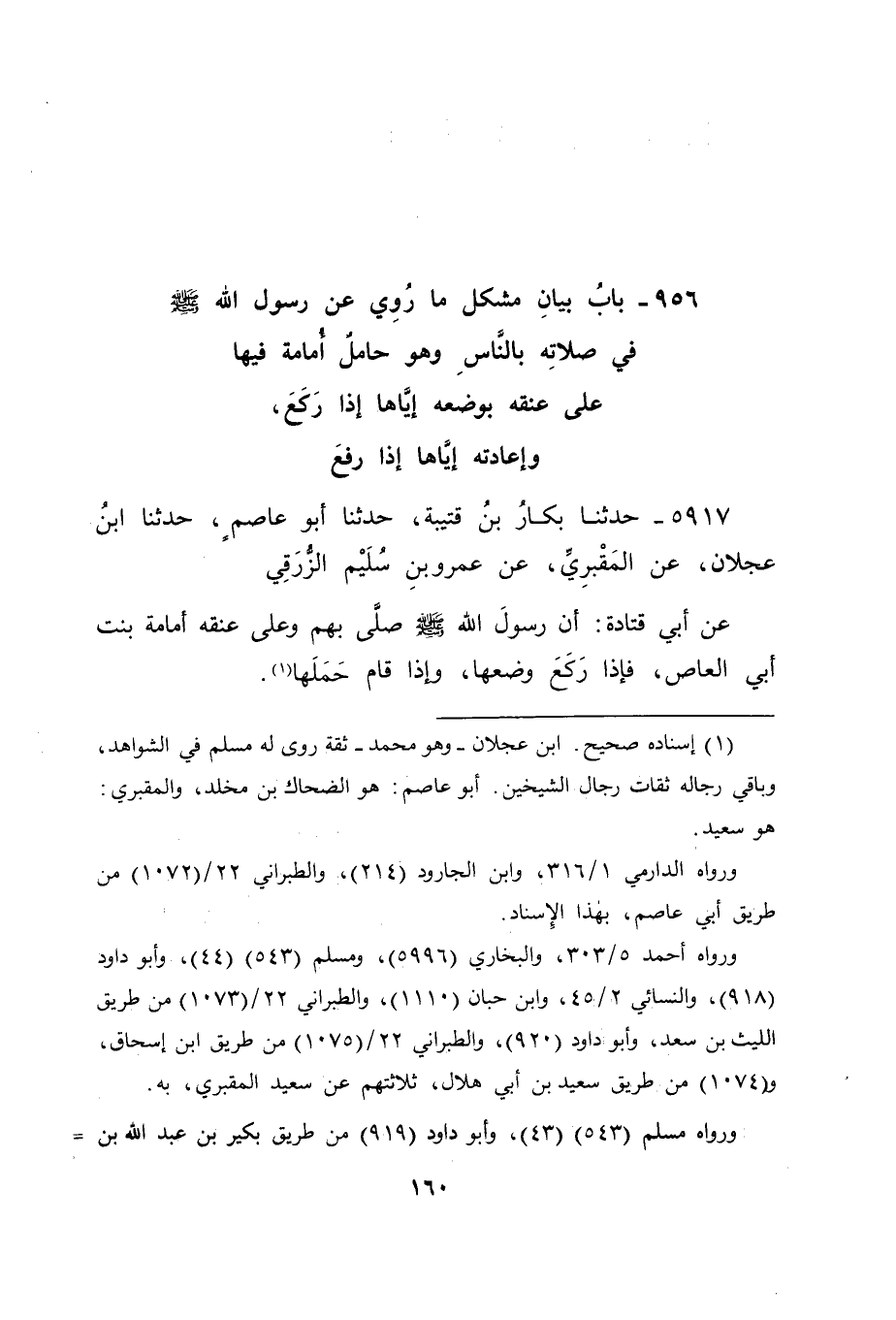 5917 - حَدَّثَنَا بَكَّارُ بْنُ قُتَيْبَةَ، حَدَّثَنَا أَبُو عَاصِمٍ، حَدَّثَنَا ابْنُ عَجْلَانَ، عَنِ الْمَقْبُرِيِّ، عَنْ عَمْرِو بْنِ سُلَيْمٍ الزُّرَقِيِّ، عَنْ أَبِي قَتَادَةَ، " أَنَّ رَسُولَ اللهِ صَلَّى اللَّهُ عَلَيْهِ وَسَلَّمَ صَلَّى بِهِمْ وَعَلَى عُنُقِهِ أُمَامَةُ بِنْتُ أَبِي الْعَاصِ، فَإِذَا رَكَعَ وَضَعَهَا، وَإِذَا قَامَ حَمَلَهَا " -[162]-