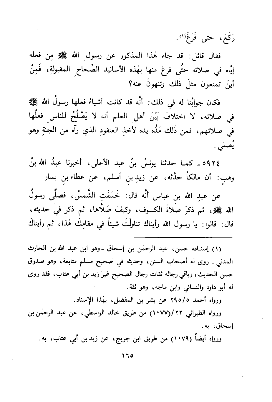 5924 - كَمَا حَدَّثَنَا يُونُسُ بْنُ عَبْدِ الْأَعْلَى، أَخْبَرَنَا عَبْدُ اللهِ بْنُ وَهْبٍ، أَنَّ مَالِكًا، حَدَّثَهُ، عَنْ زَيْدِ بْنِ أَسْلَمَ، عَنْ عَطَاءِ بْنِ يَسَارٍ، عَنْ عَبْدِ اللهِ بْنِ عَبَّاسٍ، أَنَّهُ قَالَ: خُسِفَتِ الشَّمْسُ، فَصَلَّى رَسُولُ اللهِ صَلَّى اللَّهُ عَلَيْهِ وَسَلَّمَ، ثُمَّ ذَكَرَ صَلَاةَ الْكُسُوفِ، وَكَيْفَ صَلَّاهَا، ثُمَّ ذَكَرَ فِي حَدِيثِهِ قَالَ: قَالُوا: يَا رَسُولَ اللهِ، رَأَيْنَاكَ تَنَاوَلْتَ شَيْئًا فِي مَقَامِكَ هَذَا، ثُمَّ رَأَيْنَاكَ -[166]- تَكَعْكَعْتَ؟ فَقَالَ: " إِنِّي رَأَيْتُ الْجَنَّةَ، أَوْ أُرِيتُ الْجَنَّةَ، فَتَنَاوَلْتُ مِنْهَا عُنْقُودًا، وَلَوْ أَخَذْتُهُ لَأَكَلْتُمْ مِنْهُ مَا بَقِيَتِ الدُّنْيَا " وَلَا اخْتِلَافَ بَيْنَ أَهْلِ الْعِلْمِ أَنَّهُ لَا يَنْبَغِي لِلْمُصَلِّي أَنْ يَفْعَلَ مِثْلَ هَذَا فِي صَلَاتِهِ. وَمِنْ ذَلِكَ مَا كَانَ مِنْهُ صَلَّى اللَّهُ عَلَيْهِ وَسَلَّمَ فِي إِبْلِيسَ وَهُوَ يُصَلِّي