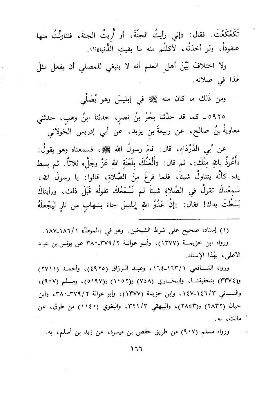 5925 - كَمَا قَدْ حَدَّثَنَا بَحْرُ بْنُ نَصْرٍ، حَدَّثَنَا ابْنُ وَهْبٍ، حَدَّثَنِي مُعَاوِيَةُ بْنُ صَالِحٍ، عَنْ رَبِيعَةَ بْنِ يَزِيدَ، عَنْ أَبِي إِدْرِيسَ الْخَوْلَانِيِّ، عَنْ أَبِي الدَّرْدَاءِ قَالَ: قَامَ رَسُولُ اللهِ صَلَّى اللَّهُ عَلَيْهِ وَسَلَّمَ، فَسَمِعْنَاهُ وَهُوَ يَقُولُ: " أَعُوذُ بِاللهِ مِنْكَ "، ثُمَّ قَالَ: " أَلْعَنُكَ بِلَعْنَةِ اللهِ عَزَّ وَجَلَّ " ثَلَاثًا. ثُمَّ بَسَطَ يَدَهُ كَأَنَّهُ يَتَنَاوَلُ شَيْئًا، فَلَمَّا فَرَغَ مِنَ الصَّلَاةِ قَالُوا: يَا رَسُولَ اللهِ، سَمِعْنَاكَ تَقُولُ فِي الصَّلَاةِ شَيْئًا لَمْ نَسْمَعْكَ تَقُولُهُ قَبْلَ ذَلِكَ، وَرَأَيْنَاكَ بَسَطْتَ يَدَكَ فَقَالَ: " إِنَّ عَدُوَّ اللهِ إِبْلِيسَ جَاءَ بِشِهَابٍ مِنْ نَارٍ لِيَجْعَلَهُ -[167]- فِي وَجْهِي، فَقُلْتُ: أَعُوذُ بِاللهِ عَزَّ وَجَلَّ مِنْكَ، فَلَمْ يَسْتَأْخِرْ، فَقُلْتُ: أَلْعَنُكَ بِلَعْنَةِ اللهِ التَّامَّةِ، فَلَمْ يَسْتَأْخِرْ، ثُمَّ قُلْتُ، فَلَمْ يَسْتَأْخِرْ، ثُمَّ أَرَدْتُ أَخْذَهُ، وَلَوْلَا دَعْوَةُ أَخِينَا سُلَيْمَانَ بْنِ دَاوُدَ لَأَصْبَحَ مُوثَقًا يَلْعَبُ بِهِ وِلْدَانُ أَهْلِ الْمَدِينَةِ " وَلَا اخْتِلَافَ بَيْنَ أَهْلِ الْعِلْمِ أَنَّهُ لَا يَنْبَغِي لِلْمُصَلِّي أَنْ يَفْعَلَ مِثْلَ هَذَا فِي صَلَاتِهِ، فَعَقَلْنَا بِذَلِكَ أَنَّ هَذِهِ الْأَشْيَاءَ مِنَ الْأَقْوَالِ، وَمِنَ الْأَفْعَالِ قَدْ كَانَتْ مُبَاحَةً فِي الصَّلَوَاتِ فِي الْأَوْقَاتِ الَّتِي فَعَلَهَا رَسُولُ اللهِ صَلَّى اللَّهُ عَلَيْهِ وَسَلَّمَ فِي صَلَاتِهِ الَّتِي كَانَ فَعَلَ ذَلِكَ فِيهَا، ثُمَّ نُسِخَتْ بَعْدَ ذَلِكَ، فَعَادَتْ أَحْكَامُ الصَّلَوَاتِ إِلَى مَا أَهْلُ الْعِلْمِ عَلَيْهِ مِنْهَا، لِأَنَّهُمْ لَا يُجْمِعُونَ عَلَى خِلَافِ مَا فَعَلَهُ رَسُولُ اللهِ صَلَّى اللَّهُ عَلَيْهِ وَسَلَّمَ إِلَّا بَعْدَ ثُبُوتِ نَسْخِ ذَلِكَ، وَرَدُّ الْأُمُورِ إِلَى مَا هُمْ عَلَيْهِ مِمَّا يُخَالِفُهُ، لِأَنَّهُمْ رَضِيَ اللهُ عَنْهُمْ مَأْمُونُونَ عَلَى مَا فَعَلُوا، كَمَا كَانُوا مَأْمُونِينَ عَلَى مَا رَوَوْا. قَالَ قَائِلٌ: فَهَلْ تَرَوْنَ عَنْ رَسُولِ اللهِ صَلَّى اللَّهُ عَلَيْهِ وَسَلَّمَ دَلِيلًا مِنْ أَقْوَالِهِ عَلَى مَا ذَكَرْتُمْ؟ -[168]- كَانَ جَوَابُنَا لَهُ فِي ذَلِكَ: