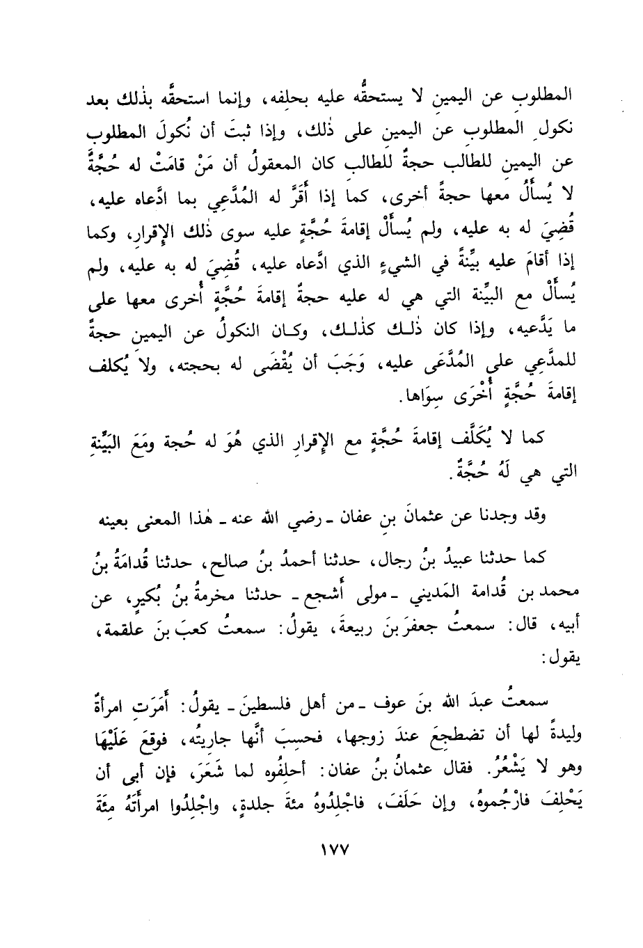 كَمَا حَدَّثَنَا عُبَيْدُ بْنُ رِجَالٍ، حَدَّثَنَا أَحْمَدُ بْنُ صَالَحٍ حَدَّثَنَا قُدَامَةُ بْنُ مُحَمَّدِ بْنِ قُدَامَةَ الْمَدِينِيُّ مَوْلَى أَشْجَعَ، حَدَّثَنَا مَخْرَمَةُ بْنُ بُكَيْرٍ، عَنْ أَبِيهِ قَالَ: سَمِعْتُ جَعْفَرَ بْنَ رَبِيعَةَ يَقُولُ: سَمِعْتُ كَعْبَ بْنَ عَلْقَمَةَ يَقُولُ: سَمِعْتُ عَبْدَ اللهِ بْنَ عَوْفٍ مِنْ أَهْلِ فِلَسْطِينَ يَقُولُ: أَمَرَتِ امْرَأَةٌ وَلِيدَةً لَهَا أَنْ تَضْطَجِعَ عِنْدَ زَوْجِهَا، فَحَسِبَ أَنَّهَا جَارِيَتُهُ، فَوَقَعَ عَلَيْهَا وَهُوَ لَا يَشْعُرُ. فَقَالَ عُثْمَانُ بْنُ عَفَّانَ: " أَحْلِفُوهُ لَمَا شَعَرَ، فَإِنْ أَبَى أَنْ يَحْلِفَ فَارْجُمُوهُ، وَإِنْ حَلَفَ فَاجْلِدُوهُ مِائَةَ -[178]- جَلْدَةٍ، وَاجْلِدُوا امْرَأَتَهُ مِائَةَ جَلْدَةٍ، وَاجْلِدُوا الْوَلِيدَةَ الْحَدَّ " فَفِي هَذَا الْحَدِيثِ حَكَمَ عُثْمَانُ لِإِبَائِهِ الْحَلِفَ بِحُكْمِ الْإِقْرَارِ، وَلَا نَعْلَمُ عَنْ أَحَدٍ مِنْ أَصْحَابِ رَسُولِ اللهِ صَلَّى اللَّهُ عَلَيْهِ وَسَلَّمَ خِلَافًا مِنْهُمْ إِيَّاهُ فِي ذَلِكَ، وَلَا إِنْكَارًا مِنْهُمْ إِيَّاهُ عَلَيْهِ، وَفِي ذَلِكَ شَدُّ مَا وَصَفْنَا، وَبِاللهِ التَّوْفِيقُ
