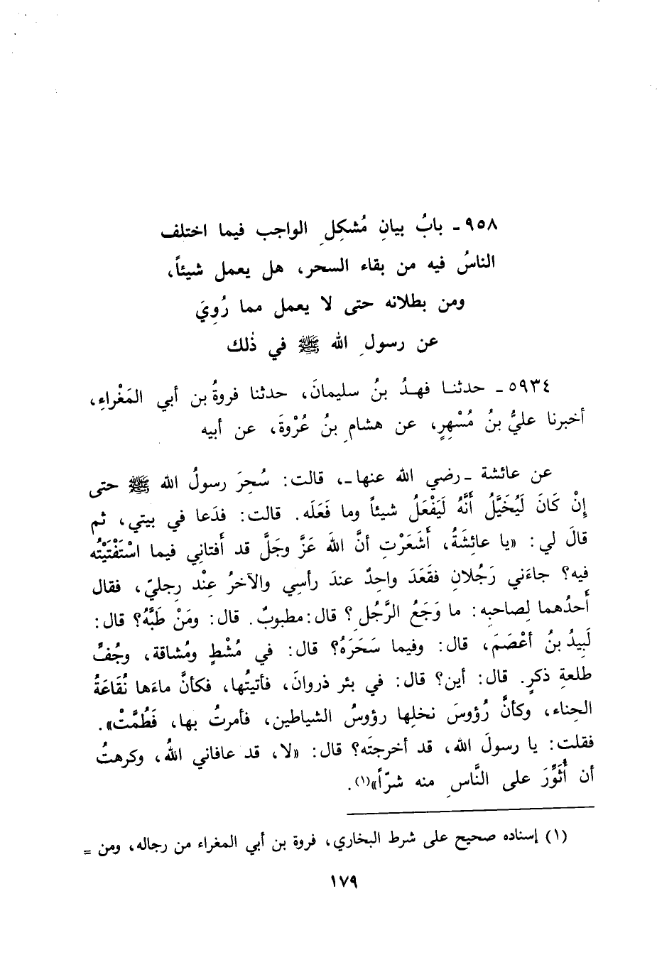 بَابُ بَيَانِ مُشْكِلِ الْوَاجِبِ فِيمَا اخْتَلَفَ النَّاسُ فِيهِ مِنْ بَقَاءِ السَّحْرِ، هَلْ يَعْمَلُ شَيْئًا، وَمِنْ بُطْلَانِهِ حَتَّى لَا يَعْمَلَ، مِمَّا رُوِيَ عَنْ رَسُولِ اللهِ صَلَّى اللَّهُ عَلَيْهِ وَسَلَّمَ فِي ذَلِكَ