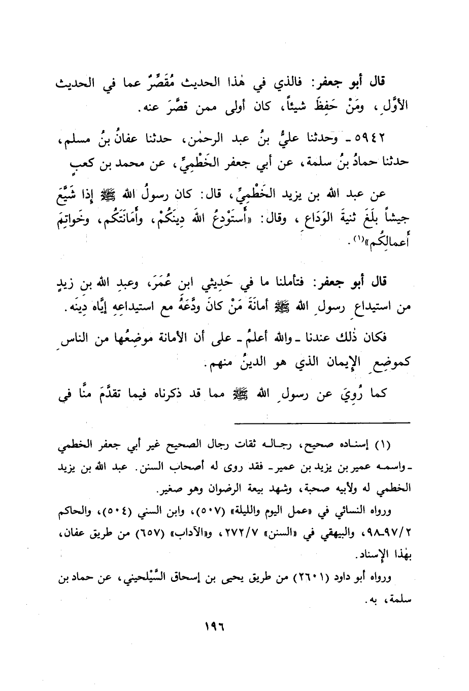 5942 - وَحَدَّثَنَا عَلِيُّ بْنُ عَبْدِ الرَّحْمَنِ، حَدَّثَنَا عَفَّانُ بْنُ مُسْلِمٍ، حَدَّثَنَا حَمَّادُ بْنُ سَلَمَةَ، عَنْ أَبِي جَعْفَرٍ الْخَطْمِيِّ، عَنْ مُحَمَّدِ بْنِ كَعْبٍ، عَنْ عَبْدِ اللهِ بْنِ يَزِيدَ الْخَطْمِيِّ قَالَ: كَانَ رَسُولُ اللهِ صَلَّى اللَّهُ عَلَيْهِ وَسَلَّمَ إِذَا شَيَّعَ جَيْشًا بَلَغَ ثَنِيَّةَ الْوَدَاعِ، وَقَالَ: " أَسْتَوْدِعُ اللهَ دِينَكُمْ، وَأَمَانَتَكُمْ، وَخَوَاتِمَ أَعْمَالِكُمْ " قَالَ أَبُو جَعْفَرٍ: فَتَأَمَّلْنَا مَا فِي حَدِيثَيْ ابْنِ عُمَرَ، وَعَبْدِ اللهِ بْنِ زَيْدٍ، مِنِ اسْتِيدَاعِ رَسُولِ اللهِ صَلَّى اللَّهُ عَلَيْهِ وَسَلَّمَ أَمَانَةَ مَنْ كَانَ وَدَّعَهُ، مَعَ اسْتِيدَاعِهِ إِيَّاهُ دِينَهُ. فَكَانَ ذَلِكَ عِنْدَنَا، وَاللهُ أَعْلَمُ، عَلَى أَنَّ الْأَمَانَةَ مَوْضِعُهَا مِنَ النَّاسِ كَمَوْضِعِ الْإِيمَانِ الَّذِي هُوَ الدِّينُ مِنْهُمْ. كَمَا رُوِيَ عَنْ رَسُولِ اللهِ صَلَّى اللَّهُ عَلَيْهِ وَسَلَّمَ مِمَّا قَدْ ذَكَرْنَاهُ فِيمَا تَقَدَّمَ مِنَّا فِي -[197]- كِتَابِنَا هَذَا مِنْ قَوْلِهِ: " لَا إِيمَانَ لِمَنْ لَا أَمَانَةَ لَهُ ". فَكَانَ الْإِيمَانُ الَّذِي هُوَ وُجُودُ الدِّينِ إِنَّمَا يَكُونُ عِنْدَ الْأَمَانَةِ، وَيَنْتَفِي عِنْدَ عَدَمِهَا. فَعَقَلْنَا بِذَلِكَ أَنَّهَا جُعِلَتْ كَهُوَ، وَأَنَّهَا مُضَمَّنَةٌ بِهِ، وَأَنَّهُ مُضَمَّنٌ بِهَا، فَاسْتَوْدَعَهُ كَمَا اسْتَوْدَعَ اللهَ جَلَّ جَلَالُهُ دِينَهُ، وَبِاللهِ التَّوْفِيقُ