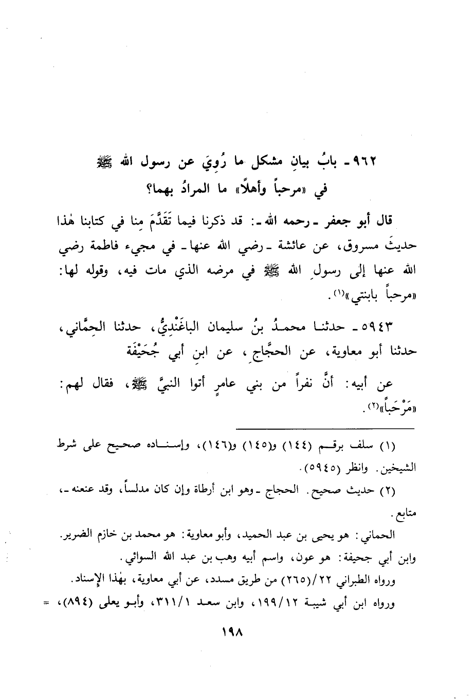 5943 - حَدَّثَنَا مُحَمَّدُ بْنُ سُلَيْمَانَ الْبَاغَنْدِيُّ، حَدَّثَنَا الْحِمَّانِيُّ، حَدَّثَنَا أَبُو مُعَاوِيَةَ، عَنِ الْحَجَّاجِ، عَنِ ابْنِ أَبِي جُحَيْفَةَ، عَنْ أَبِيهِ، " أَنَّ نَفَرًا مِنْ بَنِي عَامِرٍ أَتَوَا النَّبِيَّ صَلَّى اللَّهُ عَلَيْهِ وَسَلَّمَ فَقَالَ لَهُمْ: " مَرْحَبًا "