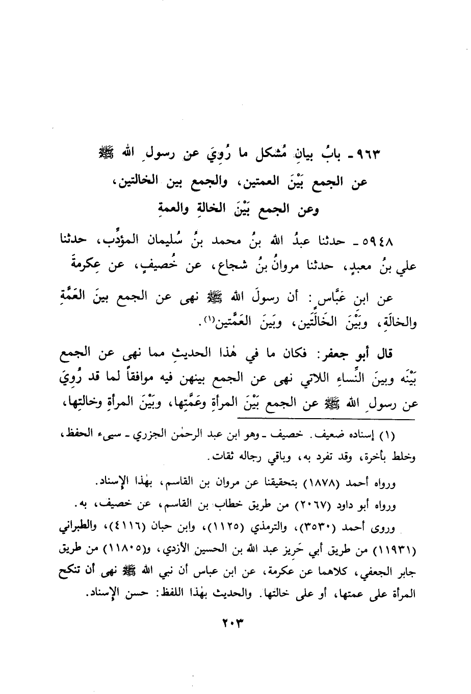 5948 - حَدَّثَنَا عَبْدُ اللهِ بْنُ مُحَمَّدِ بْنِ سُلَيْمَانَ الْمُؤَدِّبُ، حَدَّثَنَا عَلِيُّ بْنُ مَعْبَدٍ، حَدَّثَنَا مَرْوَانُ بْنُ شُجَاعٍ، عَنْ خُصَيْفٍ، عَنْ عِكْرِمَةَ، عَنِ ابْنِ عَبَّاسٍ " أَنَّ رَسُولَ اللهِ صَلَّى اللَّهُ عَلَيْهِ وَسَلَّمَ نَهَى عَنِ الْجَمْعِ بَيْنَ الْعَمَّةِ وَالْخَالَةِ، وَبَيْنَ الْخَالَتَيْنِ، وَبَيْنَ الْعَمَّتَيْنِ " قَالَ أَبُو جَعْفَرٍ: فَكَانَ مَا فِي هَذَا الْحَدِيثِ مِمَّا نَهَى عَنِ الْجَمْعِ بَيْنَهُ وَبَيْنَ النِّسَاءِ اللَّاتِي نَهَى عَنِ الْجَمْعِ بَيْنَهُنَّ فِيهِ مُوَافِقًا لَمَّا قَدْ رُوِيَ عَنْ رَسُولِ اللهِ صَلَّى اللَّهُ عَلَيْهِ وَسَلَّمَ، عَنِ الْجَمْعِ بَيْنَ الْمَرْأَةِ وَعَمَّتِهَا، وَبَيْنَ الْمَرْأَةِ وَخَالَتِهَا، -[204]- لِأَنَّ كُلَّ وَاحِدَةٍ مِنَ الْمَرْأَةِ وَعَمَّتِهَا، وَمِنَ الْمَرْأَةِ وَخَالَتِهَا، لَوْ كَانَتْ إِحْدَاهُمَا رَجُلًا لَمْ يَحِلَّ لَهُ أَنْ يَتَزَوَّجَ الْأُخْرَى، فَلَمْ يَصْلُحْ إِذْ كَانَتَا كَذَلِكَ، أَنْ يَجْمَعَ بَيْنَهُمَا بِتَزْوِيجٍ يَكُونَانِ بِهِ عِنْدَهُ. وَقَدْ كَانَ بَعْضُ النَّاسِ يَذْهَبُ إِلَى أَنَّ مَعْنَى الْجَمْعِ بَيْنَ الْعَمَّتَيْنِ فِي مَعْنَى الْجَمْعِ بَيْنَ الْخَالَتَيْنِ، إِنَّمَا كَانَ لِأَنَّ إِحْدَاهُمَا إِنَّمَا سُمِّيتْ بِاسْمِ الْأُخْرَى بِالْمُجَاوَرَةِ لَهَا، كَمَا قِيلَ: الْعُمَرَانِ لِأَبِي بَكْرٍ وَعُمَرَ، فِي أَمْثَالِ هَذَا مِمَّا تَقُولُهُ الْعَرَبُ كَذَلِكَ، وَكَانَ مَا ذَكَرَ إِنَّمَا يُجْعَلُ مِثْلُ هَذَا عَلَيْهِ عِنْدَ الضَّرُورَةِ إِلَيْهِ، وَلَيْسَ فِي هَذَا ضَرُورَةٌ تَدْعُو إِلَيْهِ، لَأَنَّا قَدْ وَجَدْنَا الْعَمَّتَيْنِ قَدْ تَكُونَانِ مِنْ وَجْهٍ آخَرَ. فَأَمَّا الْخَالَتَانِ، فَأَنْ يَكُونَ رَجُلَانِ تَزَوَّجَ كُلُّ وَاحِدٍ مِنْهُمَا ابْنَةَ صَاحِبِهِ، فَمَا وُلِدَ لِكُلِّ وَاحِدٍ مِنْهُمَا مِنْ زَوْجَتِهِ هَذِهِ إِذَا كَانَ بِنْتًا خَالَةُ صَاحِبَتِهَا، فَحَرَامٌ عَلَى رَجُلٍ أَنْ يَجْمَعَ بَيْنَهُمَا، لِأَنَّ إِحْدَاهُمَا لَوْ كَانَتْ رَجُلًا، لَكَانَ حَرَامًا عَلَيْهِ أَنْ يَتَزَوَّجَ الْأُخْرَى. وَأَمَّا الْعَمَّتَانِ: فَأَنْ يَكُونَ رَجُلَانِ تَزَوَّجَ كُلُّ وَاحِدٍ مِنْهُمَا أُمَّ صَاحِبِهِ، فَأَوْلَدَهَا بِنْتًا، فَبِنْتُ كُلِّ وَاحِدٍ مِنْهُمَا عَمَّةُ ابْنَةِ الْآخَرِ، لِأَنَّ ابْنَةَ كُلِّ وَاحِدٍ مِنْهُمَا أُخْتُ الْآخَرِ مِنْ أُمِّهِ، فَهِيَ عَمَّةُ ابْنَتِهِ، فَحَرَامٌ عَلَى رَجُلْ أَنْ يَجْمَعَ بَيْنَهُمَا، لِأَنَّ إِحْدَاهُمَا لَوْ كَانَتْ رَجُلًا دَخَلَ فِي نَهْيِهِ أَنْ تُنْكَحَ الْمَرْأَةُ عَلَى عَمَّتِهَا، أَوْ عَلَى خَالَتِهَا